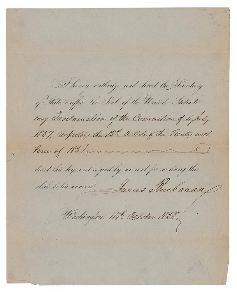 Partly-printed DS as president, one page, 8 x 10, October 14, 1858. President Buchanan directs the Secretary of State to “affix the Seal of the United States to my Proclamation of the Convention of 4 July 1857, respecting the 12th Article of the Treaty with Peru of 1851.” Signed prominently at the conclusion by James Buchanan. In fine condition, with faint toning along the edges and folds.