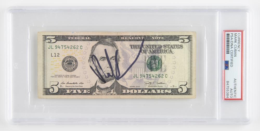 Series 2009 five-dollar bill, signed in black felt tip by Mark Cuban. In fine condition. Encapsulated in a PSA/DNA authentication holder. A desirable signed format for the Shark Tank investor and the owner of the Dallas Mavericks, whose net worth orbits around $5 billion.