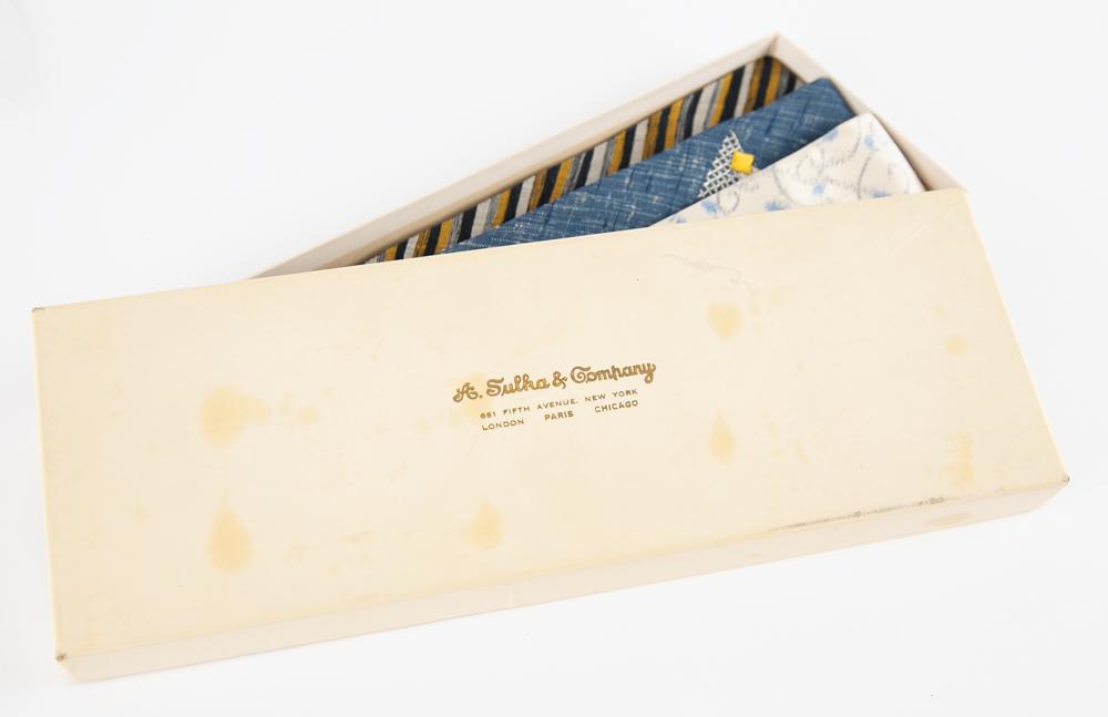 Handsome set of three vintage neckties presented by Massachusetts Senator John F. Kennedy to his former press secretary, Robert Thompson, each approximately 53.5″ in length, made by Wembley, A. Sulka & Company, and Central Cottage Industries Emporium. Included with the ties is one of JFK’s personal United States Senate business cards, 3.5 x 1.75, with a golden embossed seal and printed text, “John Fitzgerald Kennedy, United States Senate, Massachusetts,” annotated in a secretarial hand, “With all best wishes for a Merry Christmas.” In overall fine condition. Accompanied by a 1957 Christmas card from Robert and Ethel Kennedy, with its original mailing envelope.