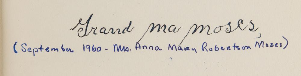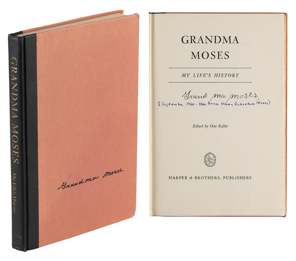 Signed book: Grandma Moses: My Life's History. NY: Harper & Brothers, 1952. Hardcover, 6.5 x 9.5, 140 pages. Signed in black ink on the title page above a collector's notation dating the autograph to September 1960. In fine condition.