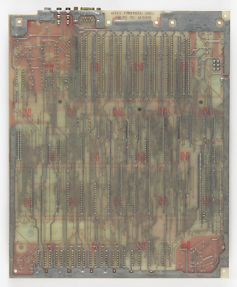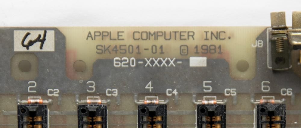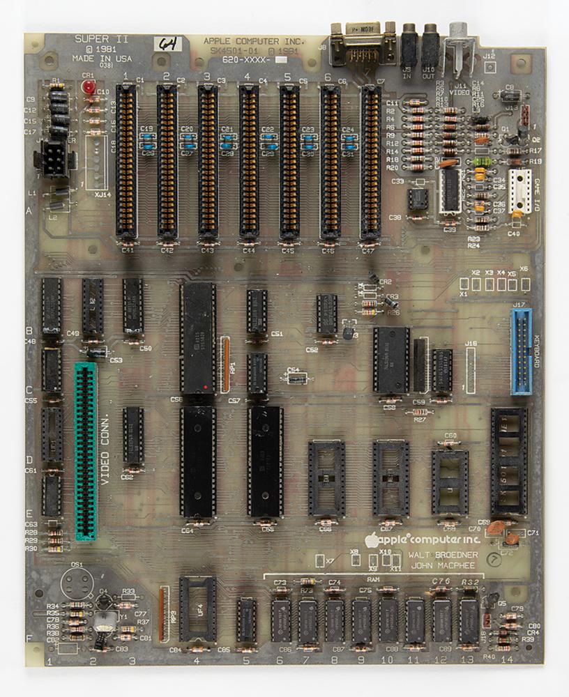 Rare Apple IIe prototype logic board #64 (of approximately 100 known to be made), known as the 'Super II,' marked on the edge with a 1981 copyright date and part/serial numbers, "SK4501-10, 620-XXXX-." This unreleased prototype predates the release of the retail Apple IIe by two years, developed primarily to stop clone makers from copying Apple's design. The board is marked with the names of designers Walt Broedner and John MacPhee below the Apple Computer, Inc. logo. Several of the chip sockets are unpopulated.