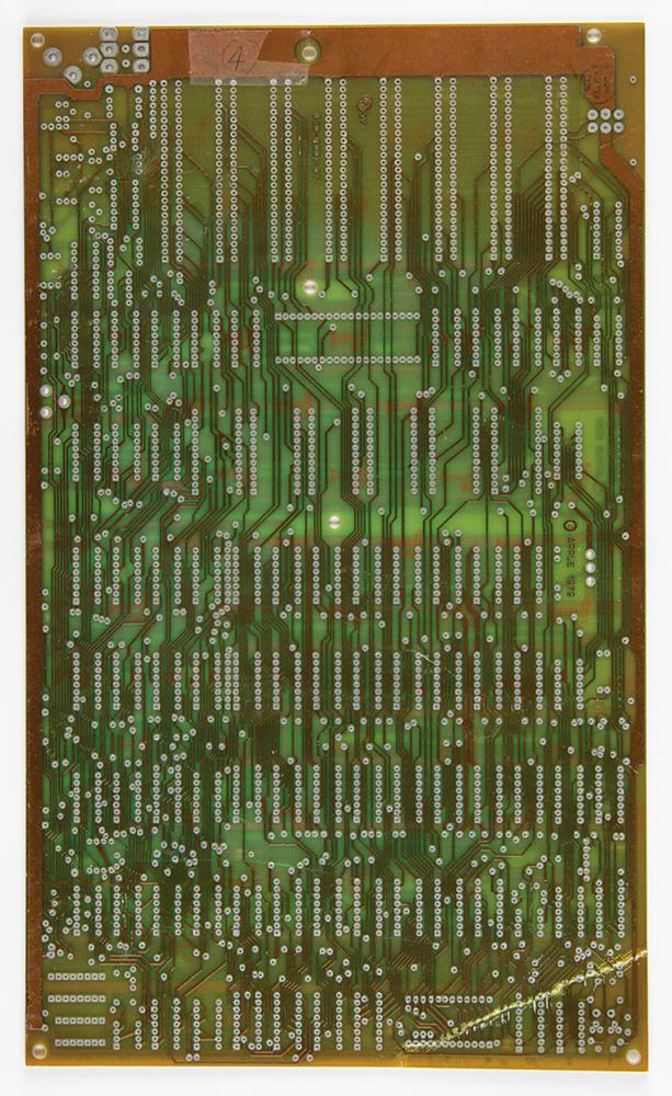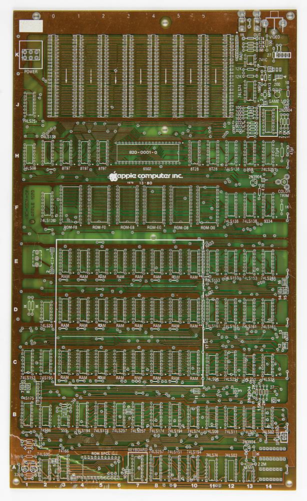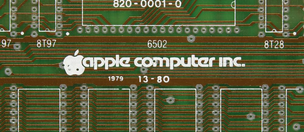 Early Apple II Plus bare logic board (green/copper), 8.5″ x 14.25″, featuring the "Apple Computer, Inc." logo with a copyright date of 1979, and marked with part number "820-0001-07." The board is cracked/bent at the lower left corner. Released in June 1979, the Apple II Plus was the second model in the Apple II series.