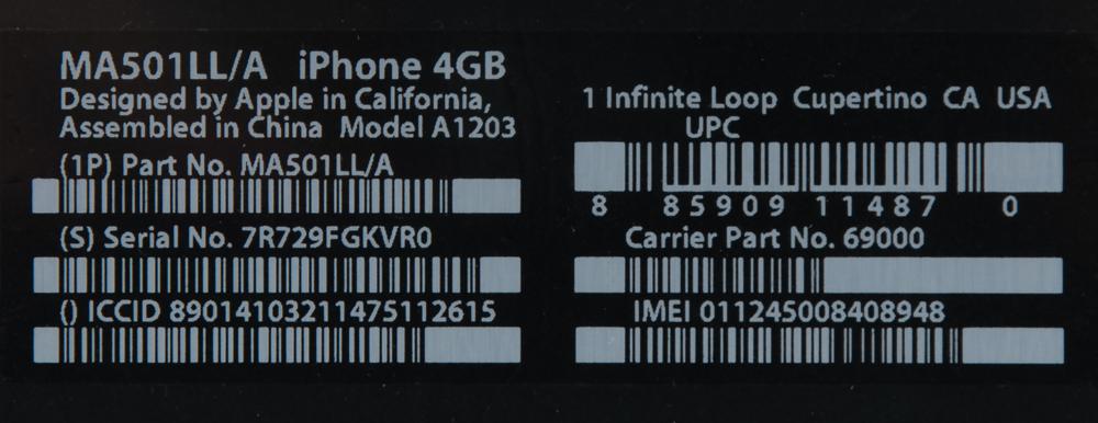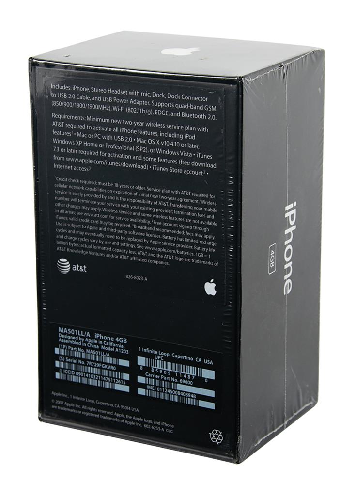 Exceedingly rare unopened first generation, first release original Apple iPhone, Model A1203, Part No. MA501LL/A (4GB), Serial No. 7R729FGKVR0. The box features a life-size image of the iPhone with twelve icons on the screen, indicating that it is from the earliest production (2007); a 13th icon, for iTunes, came later in the year. The 4GB iPhone is the rarest of all original iPhones, as it was discontinued by Apple on September 5, 2007, just over two months after the pioneering product's debut. Priced at $499, the 4GB iPhone model encountered lackluster sales as most consumers opted for the $100 upgrade to double its storage capacity to 8GB. In brand new, factory-sealed condition.