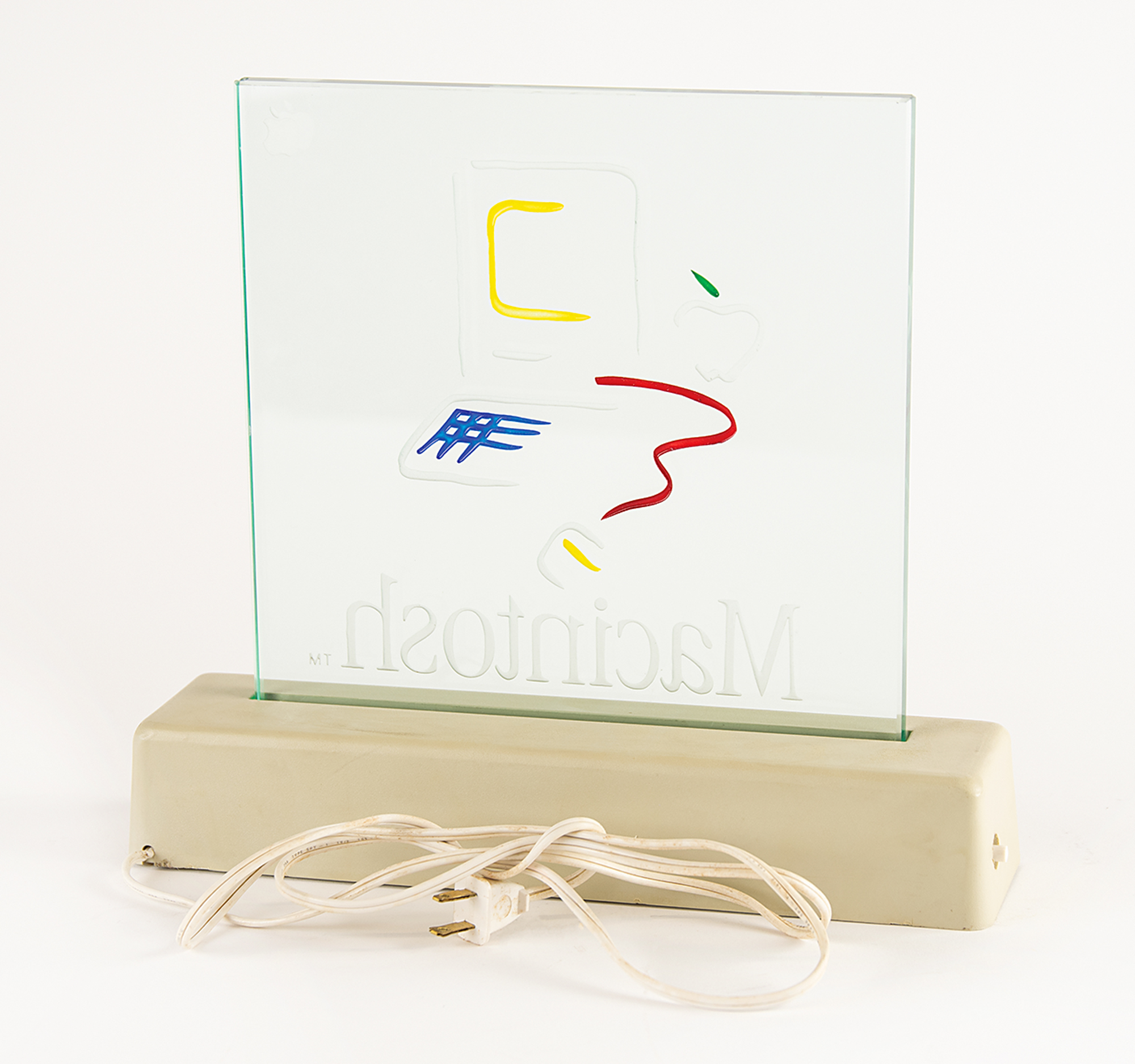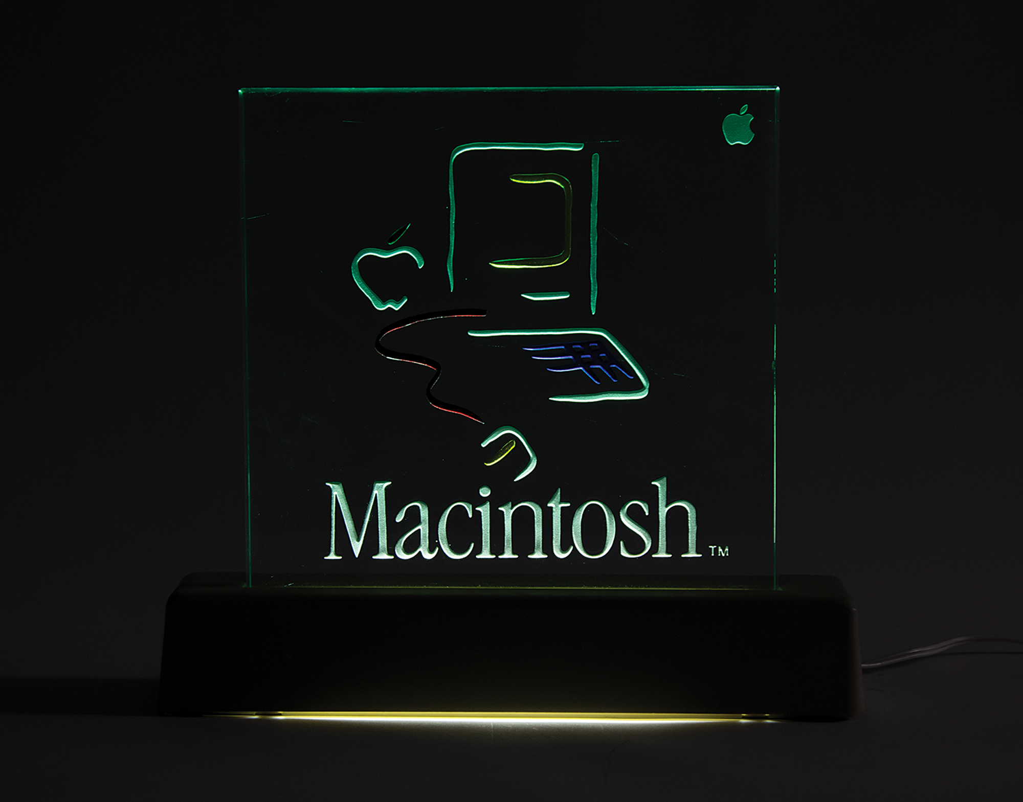 Sought-after Macintosh dealer's sign, featuring a 10″ x 10″ etched glass panel with the iconic Macintosh 'Picasso' logo, set upon a 13″ x 3″ x 2.25″ base. In fine condition, with some wear to the base. Released during the rollout of the Macintosh in 1984, these signs were given out to dealers, developers, and key personnel, and as promo items—it has been estimated that approximately 2,500 of these lighted displays were produced.