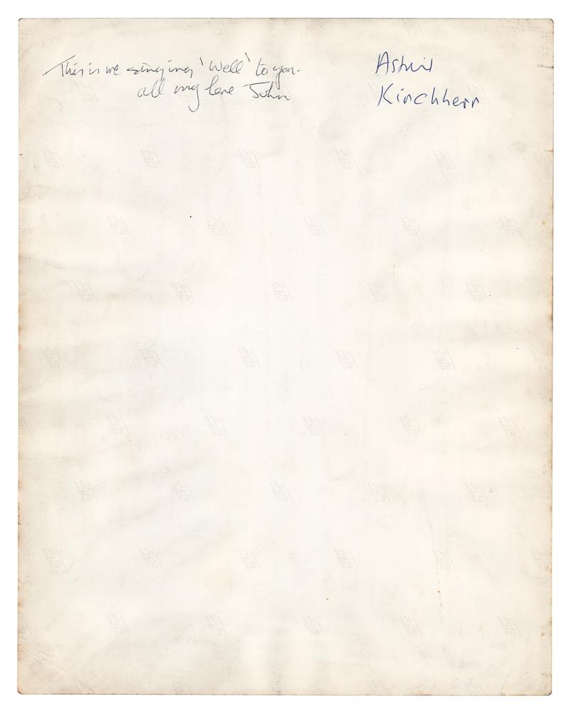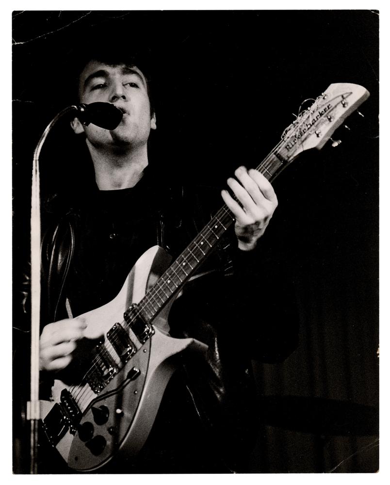 Superb vintage glossy 9.5 x 12 large-format photograph of John Lennon wearing leather and playing his 1958 Rickenbacker 325 electric guitar during a Beatles concert at the Top Ten Club in Hamburg, Germany, in 1961, signed on the reverse in black ballpoint, “This is me singing ‘well’ to you. All my love, John,” who inscribed the photo to “Astrid Kirchherr,” a close friend of the Beatles whose photographs of the band's original members are now an iconic part of rock and roll history. Reverse bears “Agfa” watermarks. The consignor notes that the signature dates to circa 1963 and this image was originally photographed by Jurgen Vollmer. In very good to fine condition, with creasing, rippling, and a few short edge tears.