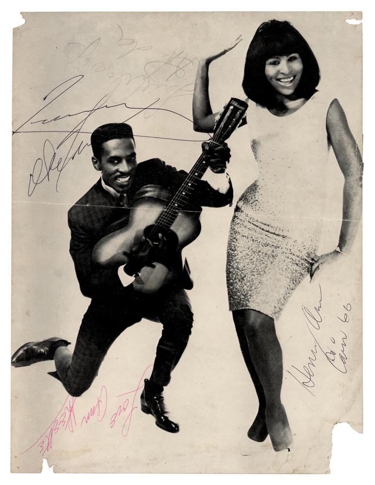 Page from a 1966 Rolling Stones UK tour program, 8 x 10.5, signed in black ballpoint by Ike and Tina Turner. The page is also signed by three others. In very good condition, with creasing, edge and corner loss, and central horizontal fold. Accompanied by a certificate of authenticity from Tracks.