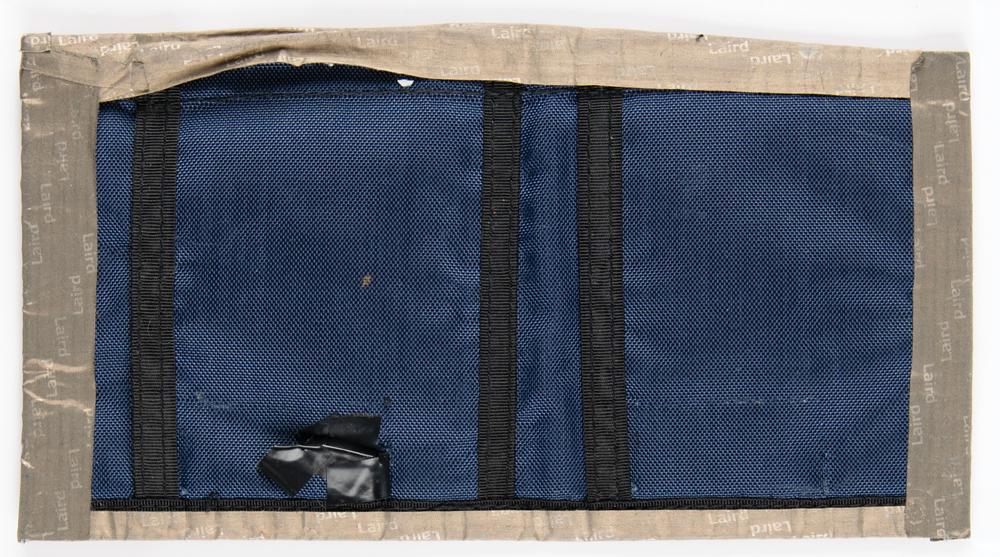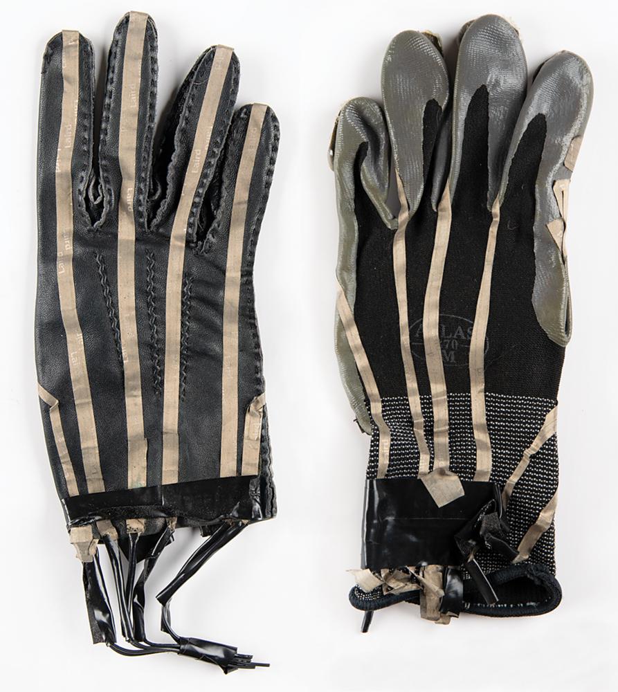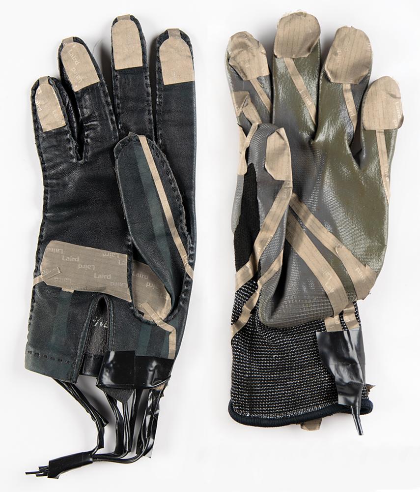 Amazing pair of early prototypes of The HandWriter typing glove that was co-developed by Douglas Engelbart and a team headed by Valerie Landau in early 2007. The HandWriter, a glove-based mobile keyboard designed for eyes-free, on-the-move usability, was conceptualized as an evolutionary upgrade to the five-key coding keyset, a device Engelbart introduced in tandem with the first computer mouse at his iconic 1968 'Mother of All Demos.’ The prototypes consist of a black left-handed gardening glove with gray grip, size medium, which Engelbart personally wore during a demonstration with Landau and noted tech blogger Robert Scoble in January 2008, and a black leather right-handed driving glove, size 7.5, which Landau wore during a HandWriter demo at the NextNow Collaboratory in Berkeley, California, in December 2008. Both gloves feature swatches of silver Laird shielding tape to the lower palm and fingertips that run the length of the back of the hand and terminate at the wrist, with Landau’s glove retaining its taped cluster of seven wires. Included with Landau’s glove is its original 8.75″ x 4.75″ fabric input pad, which was also used during the NextNow event. In overall fine condition.
