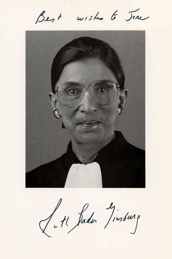 Semi-glossy 6 x 9 paperstock photo of Ruth Bader Ginsburg in her judicial robe, signed and inscribed in the upper and lower borders in black felt tip, “Best wishes to June, Ruth Bader Ginsburg.” In very good to fine condition, with scattered small surface creases; the inscription could be easily matted out if so desired.