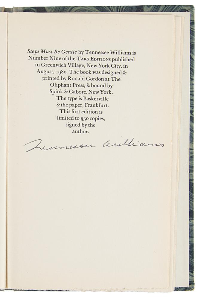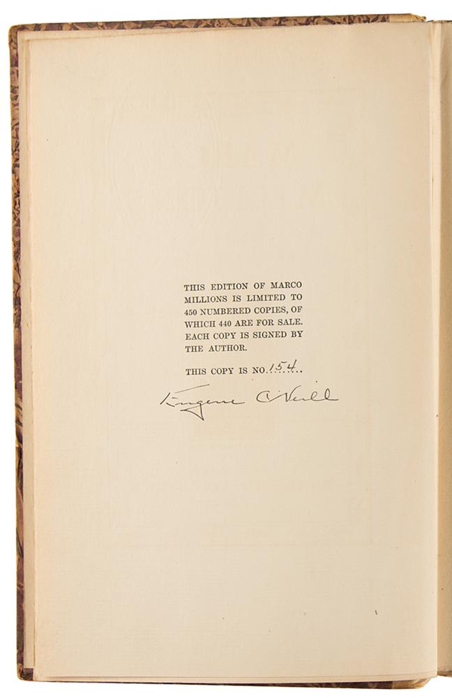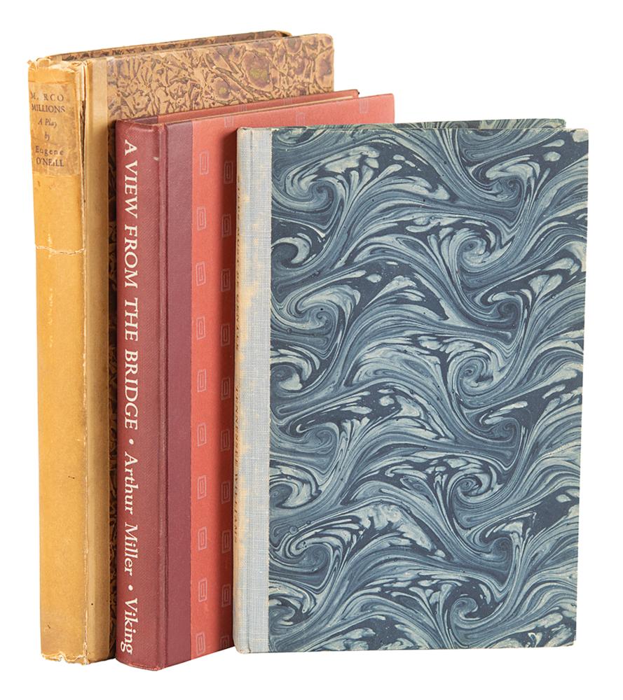 Three first edition books signed by iconic American playwrights, including two desirable limited editions. Includes: Arthur Miller (A View from the Bridge); Eugene O'Neill (Marco Millions, numbered 154/450); and Tennessee Williams (Steps Must Be Gentle, limited to 350). In overall very good to fine condition, with partial splitting to the spine paper of the O'Neill book, and sunning to the spine of the Williams book.