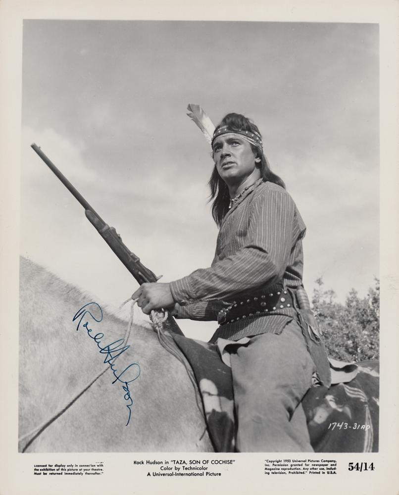 Vintage glossy 8 x 10 photo of Rock Hudson on horseback in the title role of the 1954 film Taza, Son of Cochise, signed in fountain pen. In fine condition.