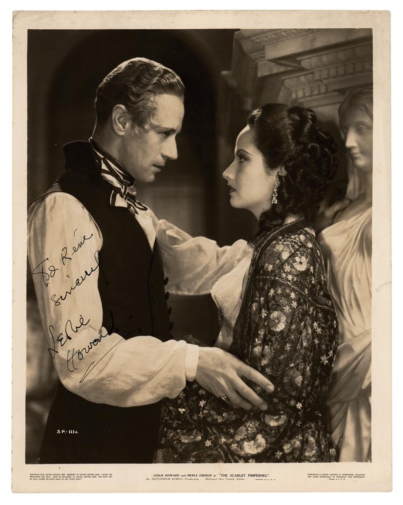 Vintage glossy 8 x 10 photo of Howard as Sir Percy Blakeney in The Scarlet Pimpernel, signed and inscribed in fountain pen, "To Rene, Sincerely, Leslie Howard.” In fine condition, with a short tear to right border, and trivial brushing to the signature.