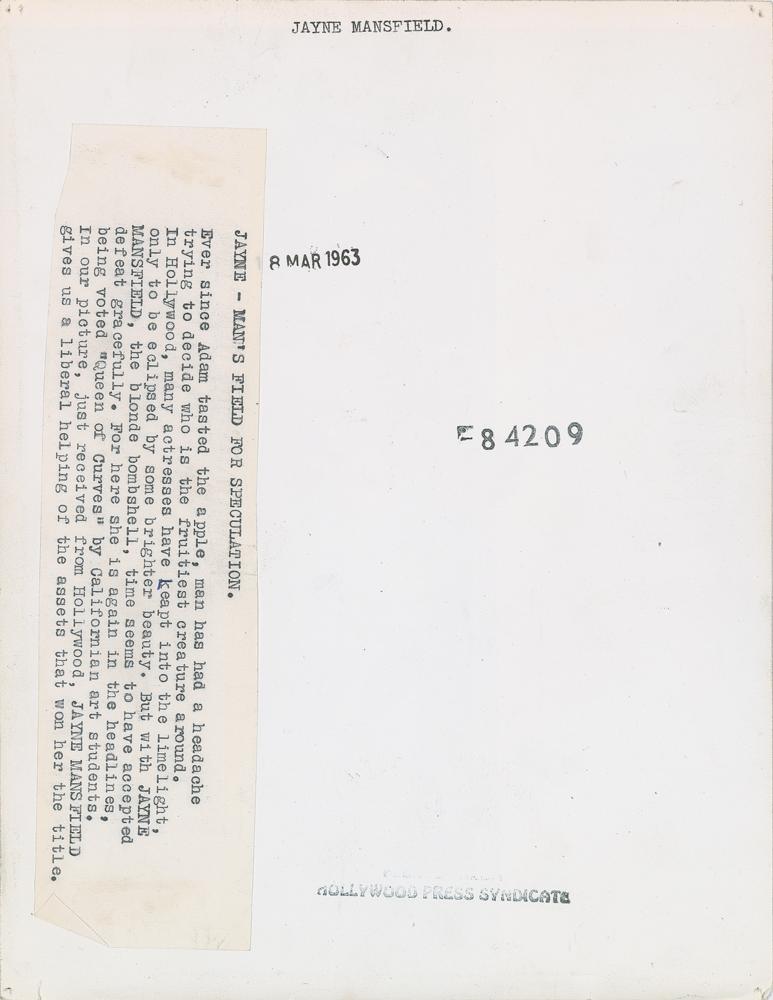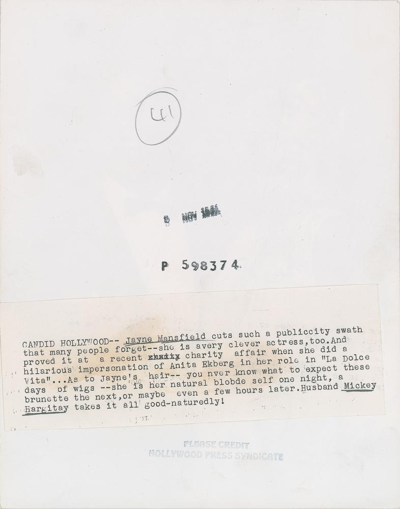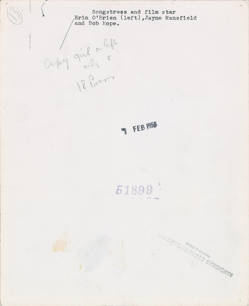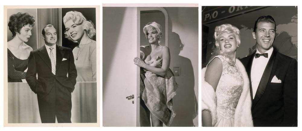 Nice grouping of three original vintage glossy silver gelatin photos of Jayne Mansfield, including: a 7.5 x 9.5 photo of her wrapped in a towel, stamp-dated March 8, 1963; a 7.5 x 9.25 photo of Mansfield with her husband Mickey Hargitay, stamp-dated November 5, 1961; and a 7 x 9 photo of Bob Hope with inset images of Mansfield and Erin O'Brien, stamp-dated February 1958. In overall very good to fine condition, with scattered light creasing, trimmed edges, and tack holes to the corners of two photos.