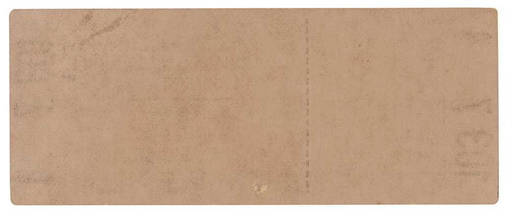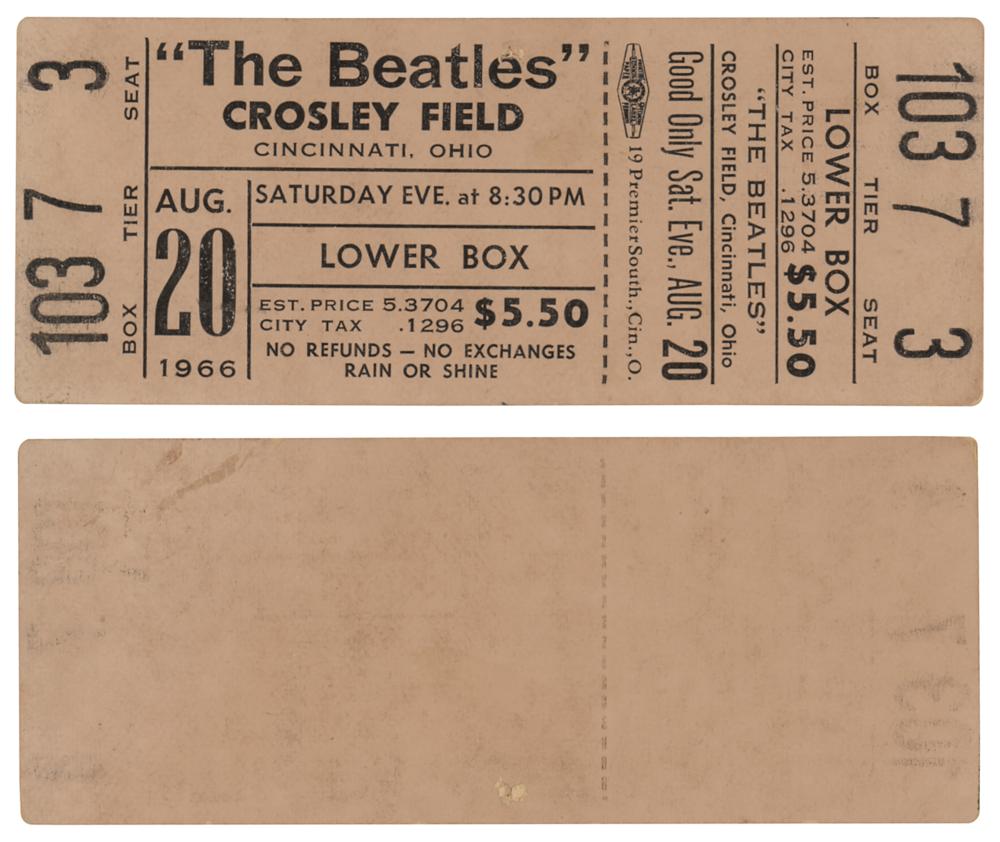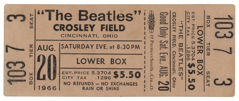 Original unused beige 4 x 1.5 concert ticket for a Beatles performance held at Crosley Field in Cincinnati, Ohio, on August 20, 1966, at 8:30 p.m., issued for Box 103, Tier 7, and Seat 3. In fine condition, with a trivial hole to end of “Beatles.” The concert was ultimately postponed until the following day at noon due to heavy rain and the risk of electrocution.