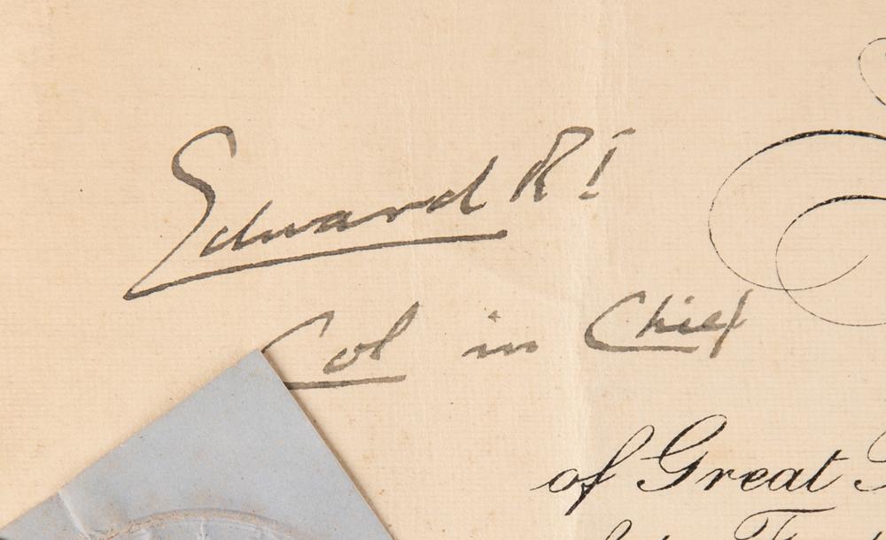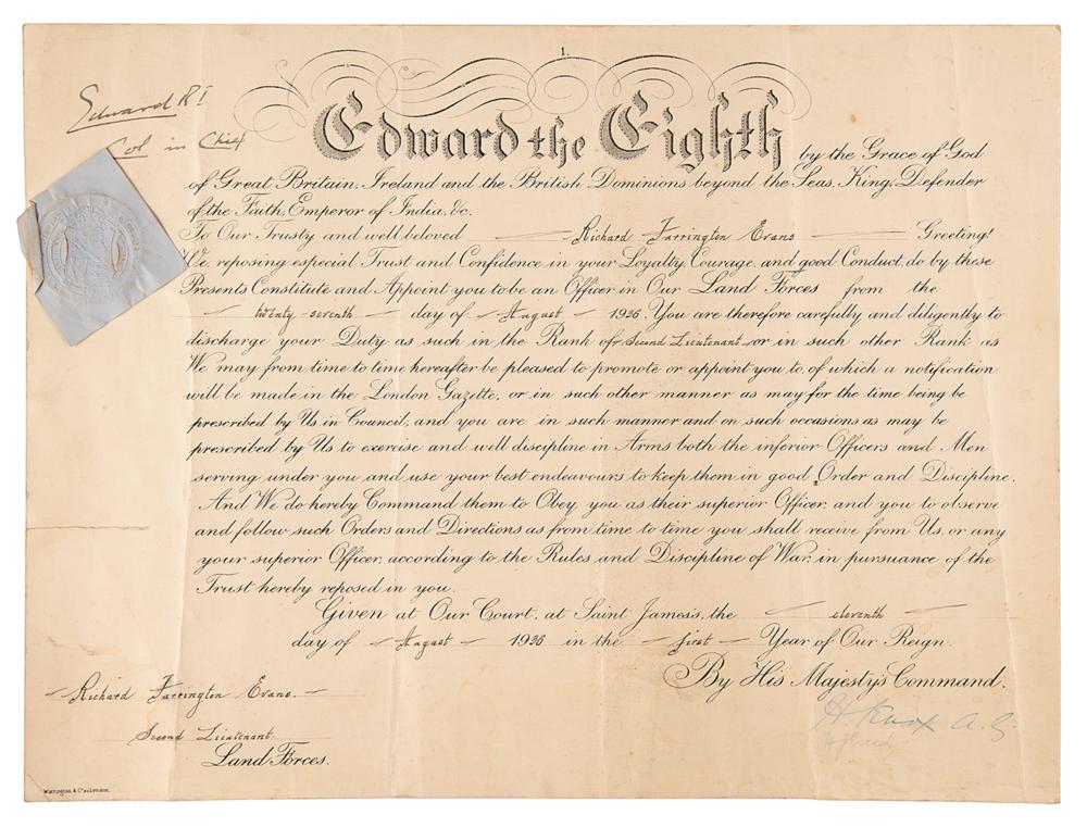 Partly-printed DS, signed “Edward R.I., Col. in Chief,” one page, 16 x 12, August 11, 1936. King Edward VIII appoints Richard Farrington "to be an Officer in Our Land Forces?in the Rank of Second Lieutenant." Boldly signed at the head by King Edward VIII during his brief reign. The embossed blue paper seal affixed below his signature remains intact. In very good condition, with a tear to the left edge, scattered creasing, light dampstaining, and multiple vertical folds.