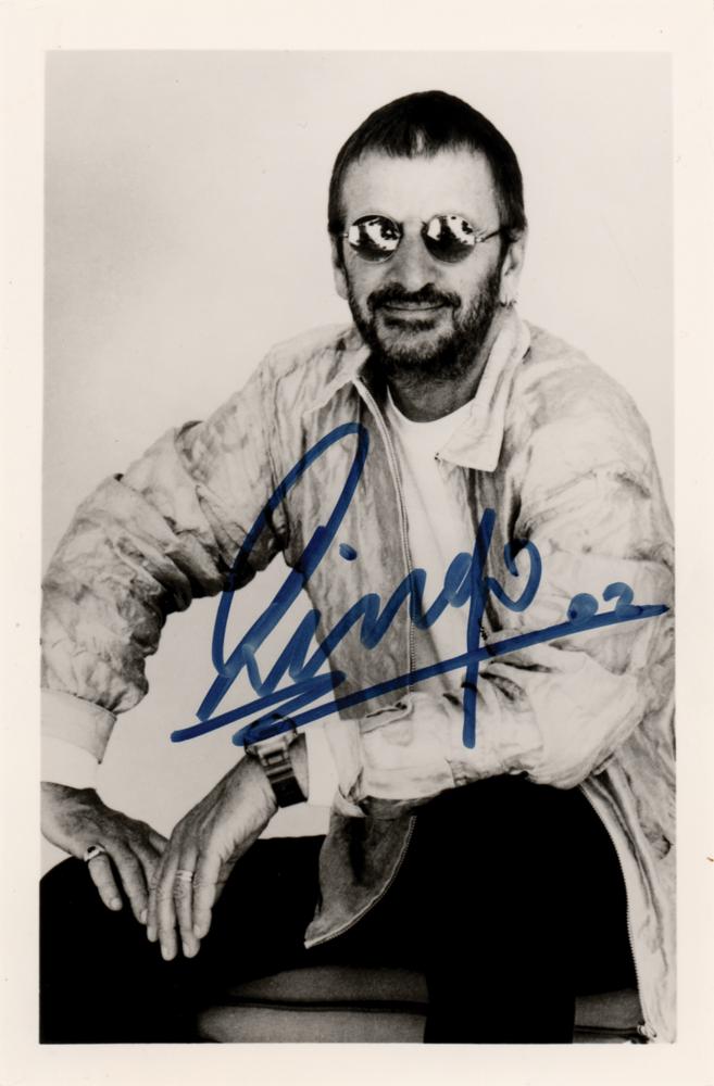 Satin-finish 4 x 6 photo of the Beatles drummer in a three-quarter-length seated pose, signed in black felt tip, "Ringo, 02." In very fine condition.