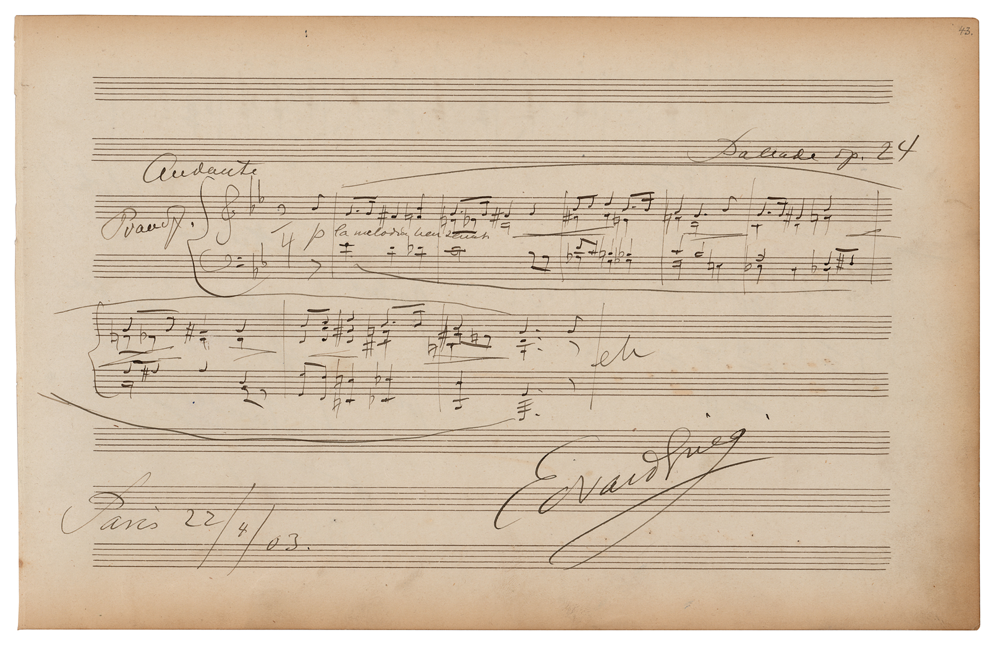 Important Norwegian composer and pianist (1843-1907) whose works, often with a strong nationalistic flavor, include such repertory staples as the 'Piano Concerto in A minor,' the incidental music to Peer Gynt, and the 'Holberg Suite.' AQMS on an off-white 10.25 x 6.5 sheet, nicely signed and dated below in ink, "Edvard Grieg, Paris, 22/4/03." Grieg pens several bars from his "Ballade, Op. 24," writing the title at the top. In fine condition, with light edge toning. Grieg's op. 24, Ballade in the Form of Variations on a Norwegian Folk Song, features fourteen themes and variations based on the Norwegian folk song 'Den nordlanske bondestand [The Northland Peasantry].'
