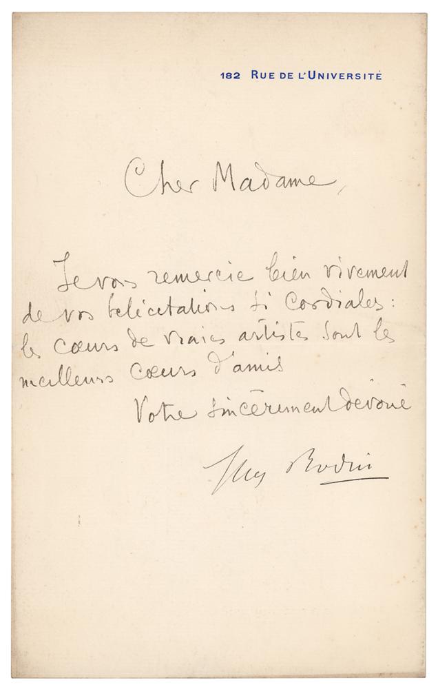 LS in French, signed “Aug. Rodin,” one page, 5 x 8, 182 rue de l'Universite (the address of his studio) letterhead, no date. Untranslated letter thanking a fellow artist, noting (translated), "The hearts of true artists are the best hearts of friends," signed at the conclusion by the celebrated sculptor. In fine condition.