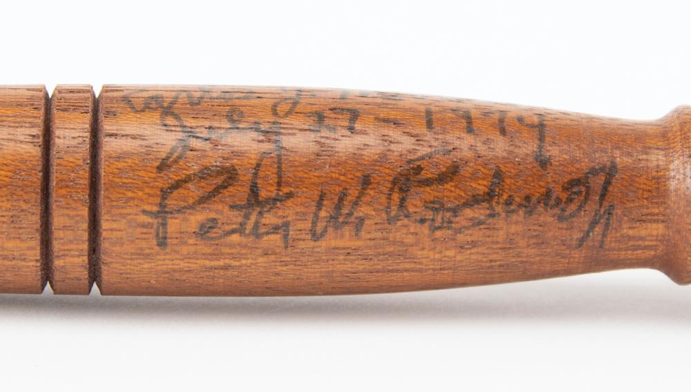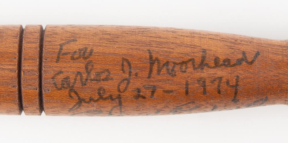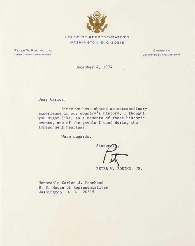 Pete Rodino, a Democratic congressman from New Jersey, was largely unknown when he was thrust into the spotlight in 1974 as chairman of the House Judiciary Committee conducting the investigation into the Watergate break-in. Carlos Moorhead, a freshman Republican representing Glendale, California, was also on the committee. Not long after Nixon's resignation and the conclusion of the hearings, Rodino wrote the offered letter, gifting Moorhead with one of the wooden gavels used during the hearings. The letter, one page, 7 x 9, personal House of Representatives letterhead, December 4, 1974, in full: “Since we have shared an extraordinary experience in our country's history, I thought you might like, as a memento of those historic events, one of the gavels I used during the impeachment hearings.” The referenced wooden gavel, which measures 12″ in length, is annotated in black ink by Rodino on the handle, “For Carlos J. Moorhead, Peter W. Rodino,” who adds a date of July 27, 1974, the day the first article of impeachment against Nixon was passed.