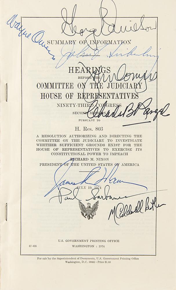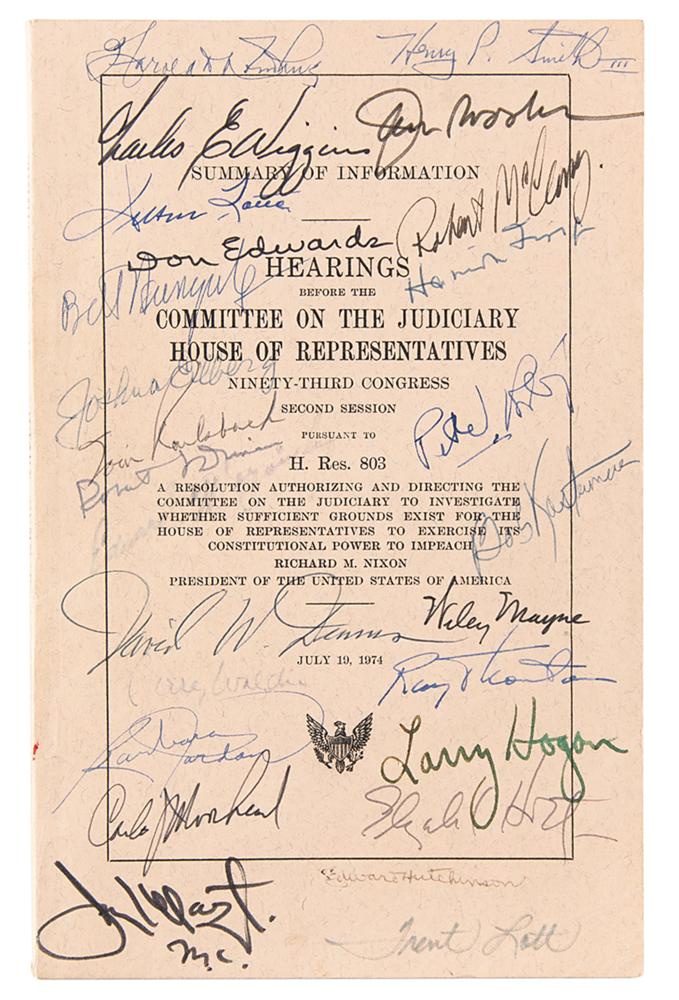 The offered booklet, 177 pages, 5.75 x 9, containing the “Hearings Before the Committee on the Judiciary, House of Representatives, Ninety-Third Congress, Second Session, Pursuant to H. Res. 803,” dated July 19, 1974, is signed in ink and felt tip on the front cover and title page by 26 of the 38 members of the House of Representatives Judiciary Committee, including: