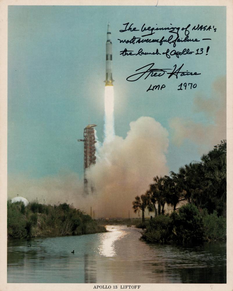Official color 8 x 10 NASA lithograph of the liftoff of the Apollo 13 mission from Kennedy LC-39A on April 11, 1970, signed in black felt tip, "The beginning of NASA's most successful failure — the launch of Apollo 13! Fred Haise, LMP 1970." In fine condition.