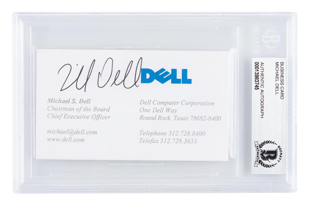 Founder, chairman, and CEO of Dell Technologies (born 1965) which has grown into one of the world's largest technology infrastructure companies. Dell Computer business card belonging to Michael Dell, 3.5 x 2, which identifies him as "Chairman of the Board, Chief Executive Officer," signed in black ink, "M. Dell." In very fine condition, with a JSA label affixed to the reverse. Encapsulated by Beckett Authentication Services.