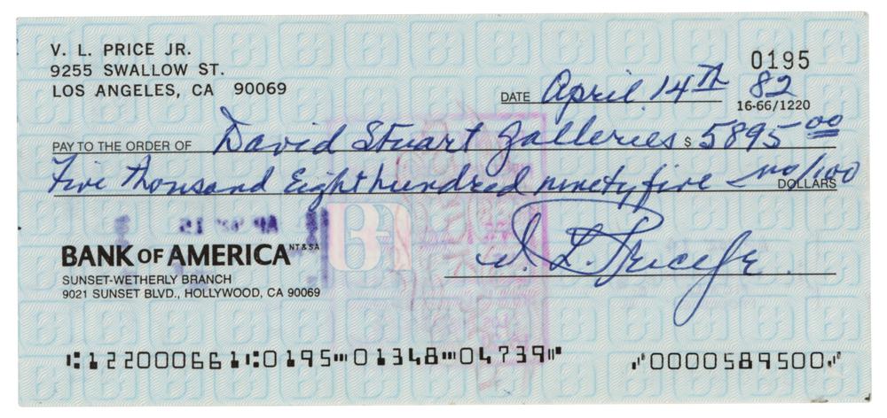 Personal check, 6 x 2.75, filled out and signed by Price, "V. L. Price, Jr.," payable to David Stuart Galleries for $5895, April 14, 1982. In very fine condition.