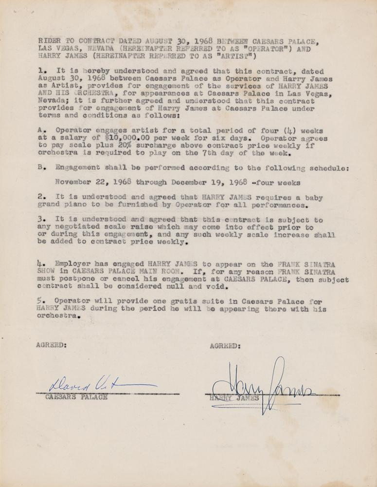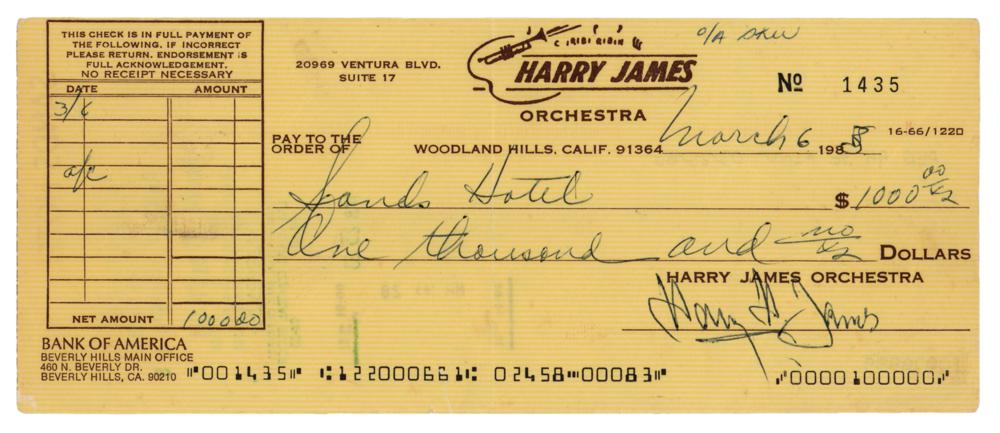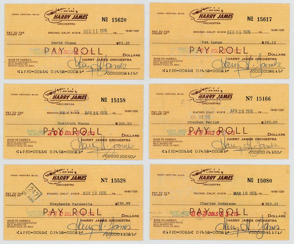 Group of eight items signed by trumpet-playing band leader Harry James, including: six 1976 payroll checks, 6.2 5x 3.5, each signed "Harry H. James," made payable to the members of his orchestra musicians (and endorsed by each on the reverse), including saxophone player Pat Longo, saxophone player Stephen Perlow, lead trumpet player Dominick Buono, bass and guitar player David Stone, guitar player Charles Anderson, and vocalist Stephanie Caravella; a rider for a contract to "appear on the Frank Sinatra Show" at Caesars Palace in Las Vegas in 1968, signed "Harry James"; and a 1983 check signed "Harry H. James," made payable to the Sands Hotel for $1000. In overall fine condition, with some light staining to the document.