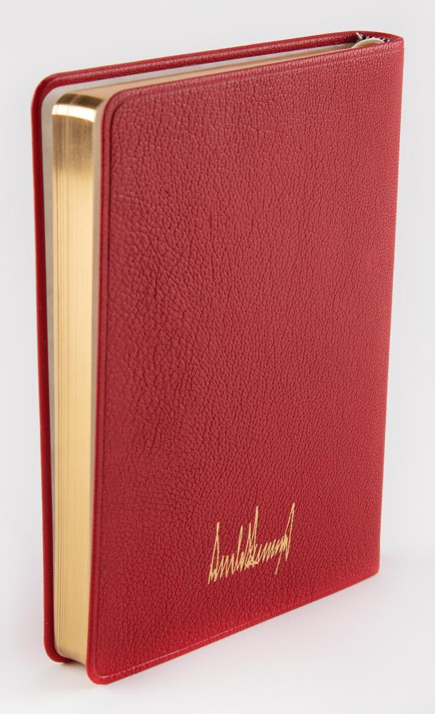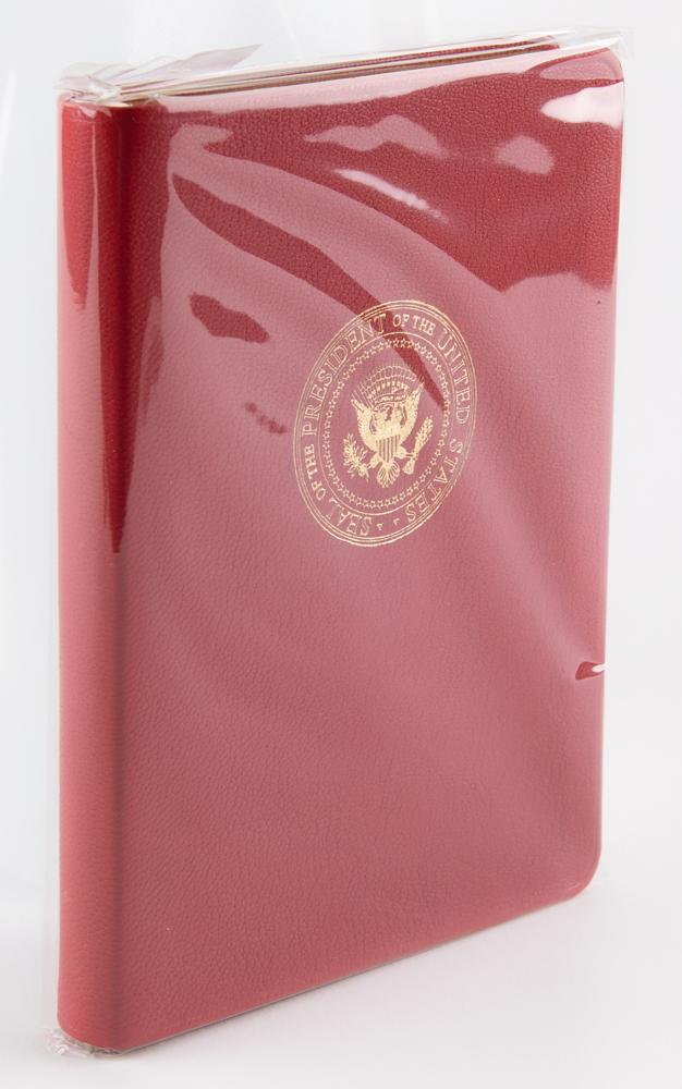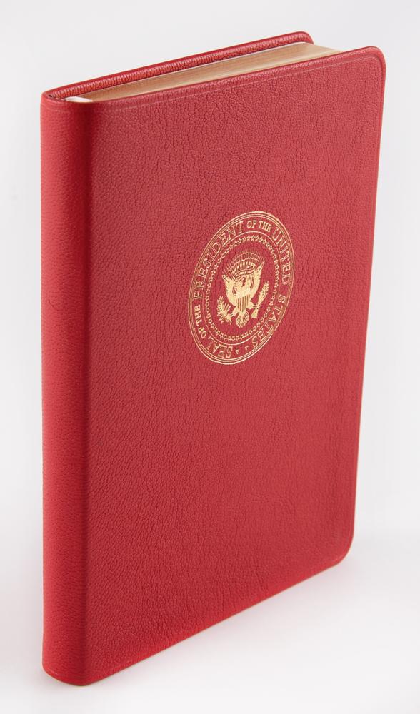 Beautiful White House-exclusive journal notebook produced by Shinola in very limited quantities during the presidency of Donald Trump, bound in soft red leather with the seal of the president of the United States and Trump’s facsimile signature imprinted in gilt to the flexible front and back boards. Includes the original plain paper box. The book features an attractive gilt-edged textblock and a silk marker ribbon. In very fine condition, with some light wear to the paper box.