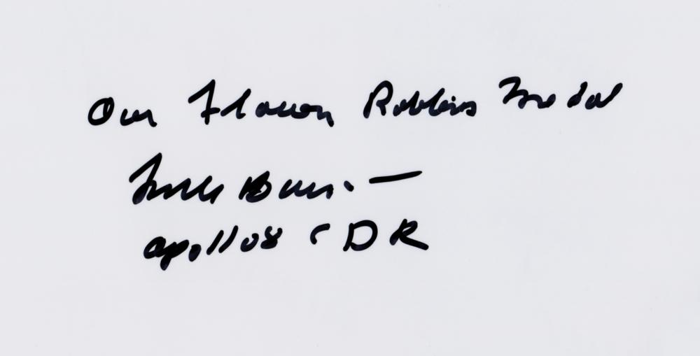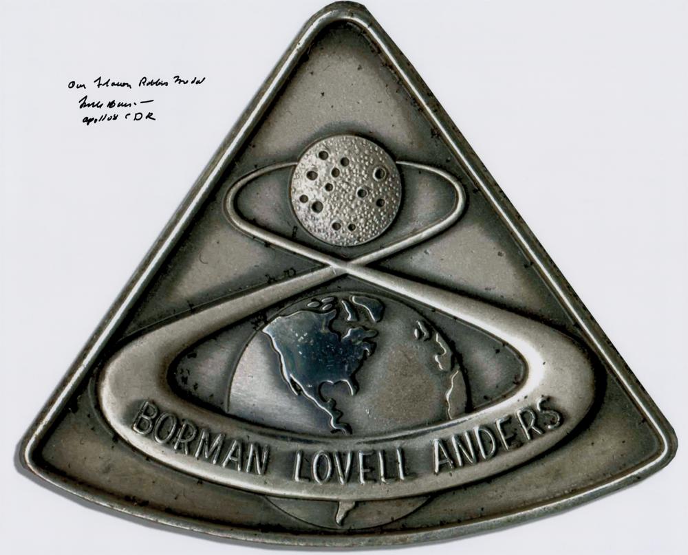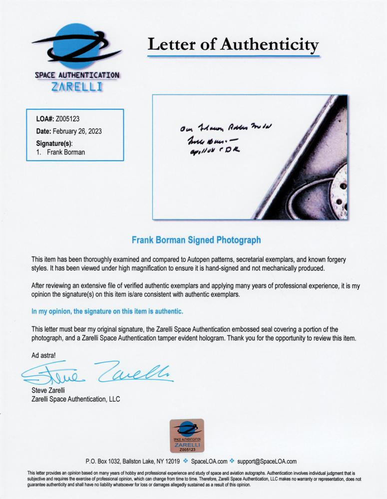 Color glossy 20 x 16 photo of the Robbins medallion made for the Apollo 8 mission, signed in black felt tip, "Our flown Robbins medal, Frank Borman — Apollo 8 CDR." In fine condition. Accompanied by a full letter of authenticity from Zarelli Space Authentication.