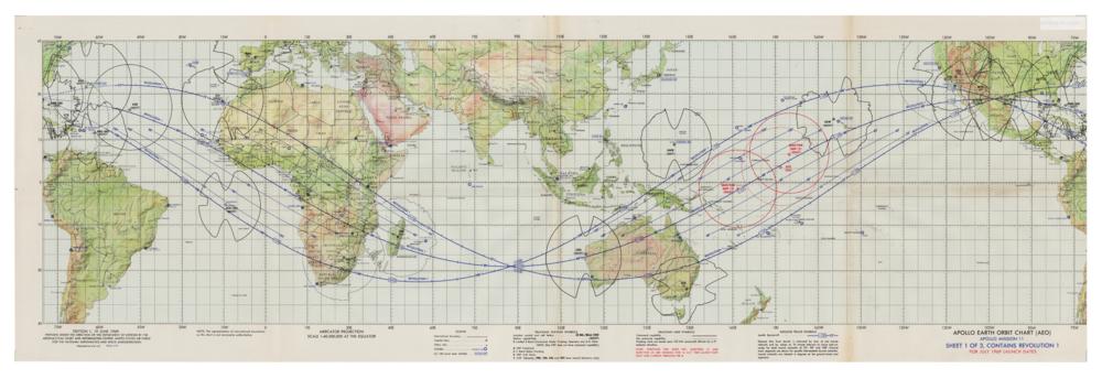 Sought-after color first edition of the Apollo 11 Earth Orbit Chart sheet 1 of 3, containing revolution 1, 41.5 x 13.5, dated June 19, 1969, displaying the various tracks and symbols for the Apollo spacecraft, as well as translunar injection burn initiation and termination, and various points of command capability. Lithographed by ACIC 6-69, and prepared under the direction of the Department of Defense by the Aeronautical Chart and Information Center. A white label to the upper right is affixed over an ownership stamp. Rolled and in fine condition, with faint toning along the intersecting folds, and staples holes to the upper left corner.