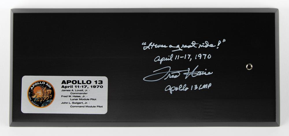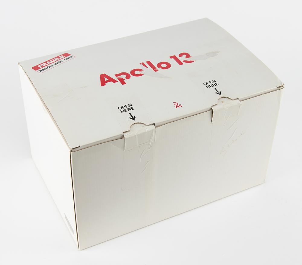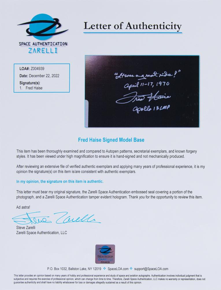 Beautiful 1:50 scale model replica of the Apollo 13 Command Module Odyssey and Lunar Module Aquarius by The Danbury Mint. This intricately crafted and hand-painted replica separates into four individual components and, when docked altogether, approximately measures 5.75 x 13 x 16; when displayed on the 12.75 x 5.75 wooden base, the model reaches an impressive 13.75″ in height. The base is signed in white ink: “‘It was a great ride,’ April 11-17, 1970, Fred Haise, Apollo 13 LMP.” In fine condition. Accompanied by the original box, which features wear and tear, and a full letter of authenticity from Zarelli Space Authentication.