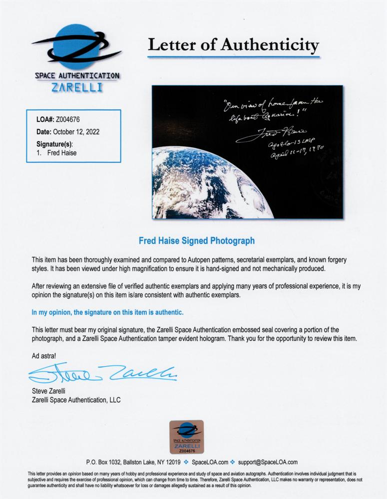 Gorgeous color satin-finish 17.25 x 15.75 photo of planet Earth as seen from space, signed in silver ink, "'Our view of home from the lifeboat Aquarius!' Fred Haise, Apollo 13 LMP, April 11-17, 1970." In fine condition. Accompanied by a full letter of authenticity from Zarelli Space Authentication.