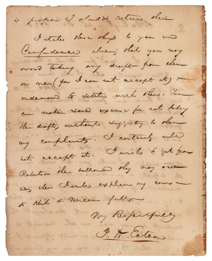 Politician (1790-1856) who served as Secretary of War under President Jackson and played a key role in the 'Petticoat Affair' which led to the resignation of all but one of Jackson’s cabinet members and facilitated Martin Van Buren's rise to the presidency. ALS signed “J. H. Eaton,” one page both sides, 7.75 x 9.75, December 22, 1820. Handwritten letter to an unnamed recipient, in full: “I have recd. From Kirk & Mercier a letter requesting that I will honor a draft if drawn in y'r favor for $150. It is true I have rec’d from Mr. Robertson at Nashville that am't as due to them; but those gentlemen for the life of Jackson placed in their hands in 1817 one no more than this; it is not proper therefore that I should accept their draft. I wrote you last winter upon this subject & you hence will have some recollection of it. Since then $ 250 was p'd to my order, still the debt over & above that rec’d from Robertson is not discharged; Their conduct towards me in this business is such as I never have, nor could approve of and now that the funds are in my hands it is proper I should return them. I state these things to you in confidence alone: that you may avoid taking any draft from them on me (for I cannot accept it) & endeavor to settle with them. You can make some excuse for not taking the draft, without suggesting to them my complaints. I certainly will not accept it. I wish to get from Robertson the balance they may owe me, then I will explain my course to Kirk & Mercier fully.” In very good to fine condition, with scattered staining, and old tape residue along the left edge.