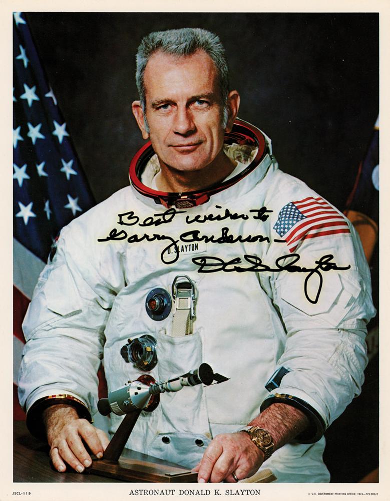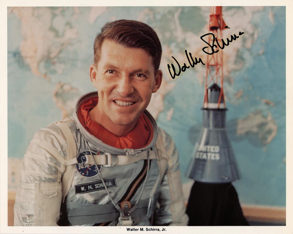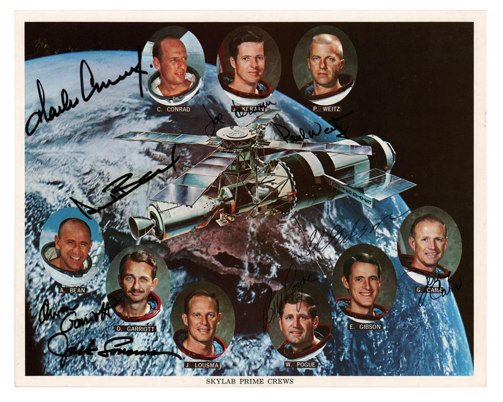 Official color 10 x 8 NASA lithograph of the Skylab space station with 'floating head' images of the nine prime crew members, signed in felt tip and ballpoint by all nine: Charles Conrad, Joe Kerwin, Paul Weitz, Alan Bean, Owen Garriott, Jack Lousma, Bill Pogue, Ed Gibson, and Jerry Carr. In very fine condition.