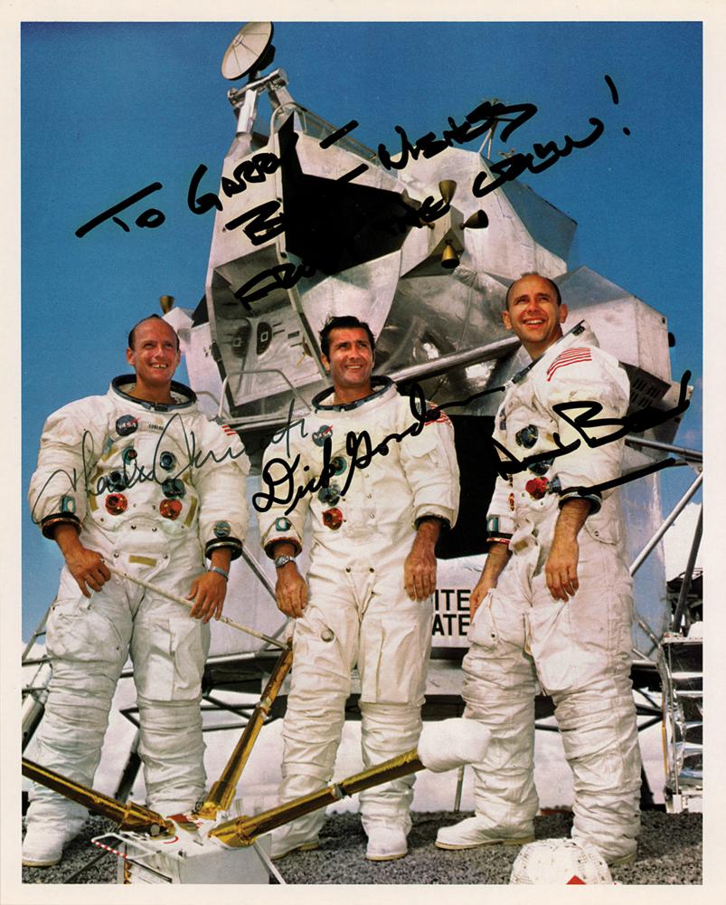 Official color 8 x 10 NASA lithograph of the Apollo 12 crew posing in their white space suits in front of the lunar module, signed and inscribed in black felt tip, “To Garry — Best wishes, from the crew! Alan Bean,” “Charles Conrad, Jr.,” and “Dick Gordon.” In very good to fine condition, with a crease touching the inscription, and light haloing to the signatures.