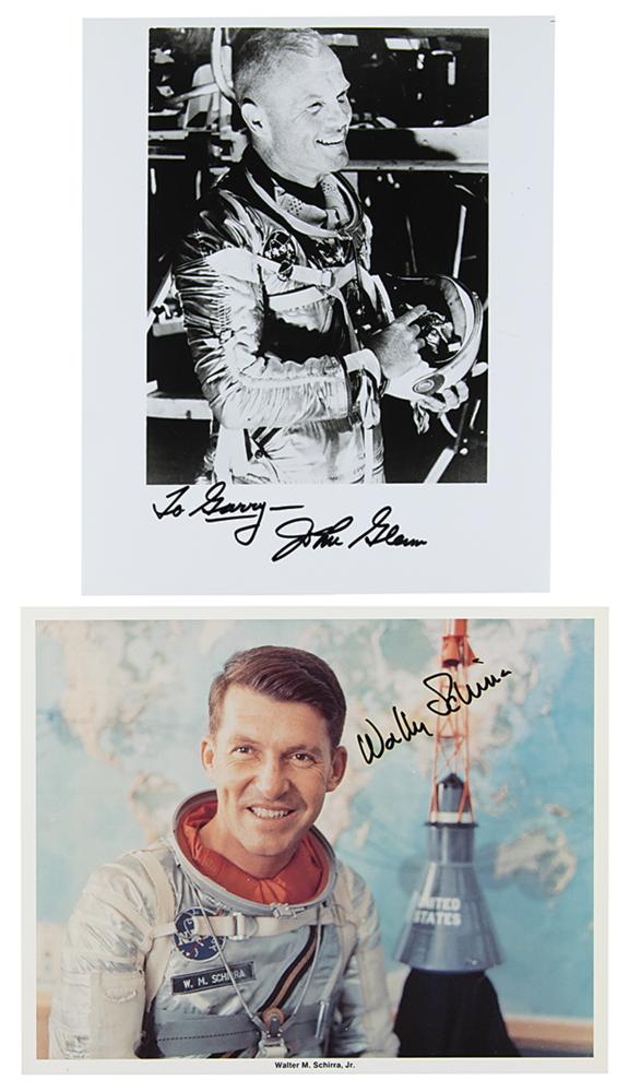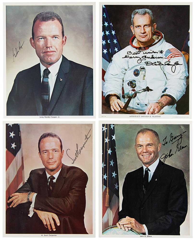 Group lot of six photographs signed by a Project Mercury astronaut, all but one official color 8 x 10 NASA lithographs, each signed in black felt tip by the pictured astronaut: Scott Carpenter, Gordon Cooper, John Glenn (2, both ins), Wally Schirra, and Deke Slayton. In overall fine condition, with haloing to the Slayton ink.