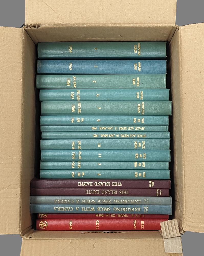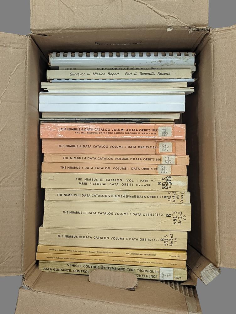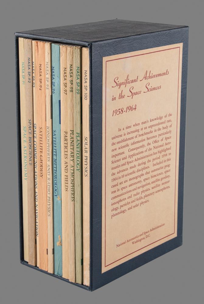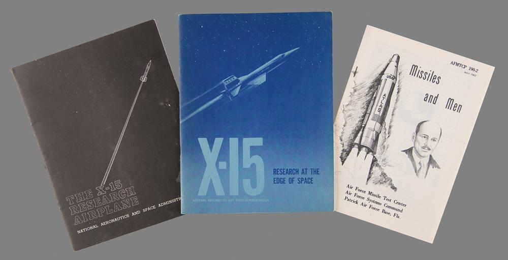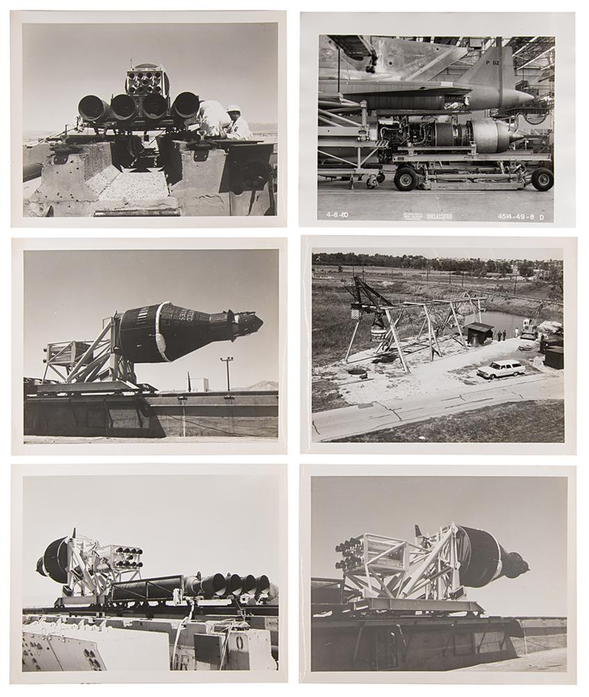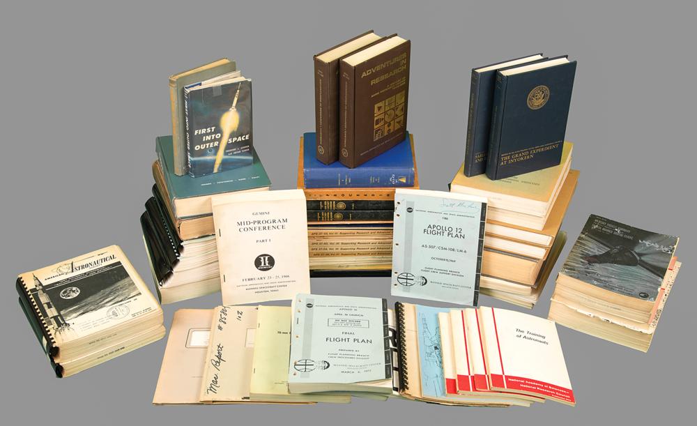 Massive and diverse collection of over 800 aerospace artifacts covering the full breadth of American space exploration, from the early days of rocket propulsion, through NASA’s landmark Mercury, Gemini, and Apollo missions, up and until the international Space Shuttle program. The collection includes numerous Apollo flight plans, NASA Fact Sheets, Space Program Summaries, Study Guides, and sundry reports, manuals, and press packets, offering comprehensive information related to essentially all aspects of the Apollo journey. Ample literature on Mercury and Gemini is also present, which is complemented by a wide array of books, paperwork, pamphlets, and other volumes dedicated to the progress of American rocketry and firepower, the hypersonic X-15 aircraft, and the development of space probes and satellites like the Surveyor, Ranger, and Mariner programs. A large portion of the archive contains over 300+ vintage photographs, the majority of which were produced by North American Aviation to showcase and study various hardware and missiles like the SM-64 Navaho missile, whose design was influential to the Saturn I and Saturn V moon rockets. Rounding off the collection is a large assortment of early NASA ephemera like maps, stickers, postcards, and more. In overall very good to fine condition. A magnificently dense assemblage of early space publications filled with rare in-house technical texts and lesser-known works that amount to a makeshift library of hidden space gems.
