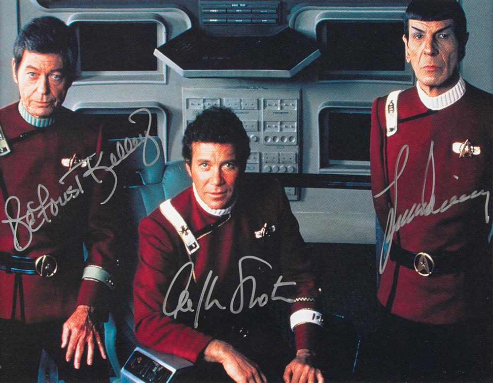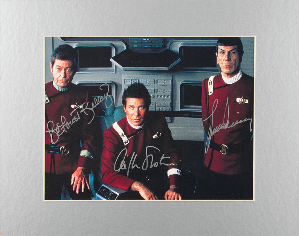 Color 9.75 x 7.5 cardstock photo of Leonard McCoy, James T. Kirk, and Spock from the 1982 science fiction film Star Trek II: The Wrath of Khan, signed in silver ink by DeForest Kelley, William Shatner, and Leonard Nimoy. Matted to an overall size of 14 x 11. In fine condition.