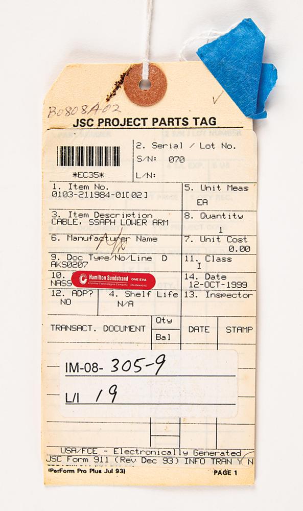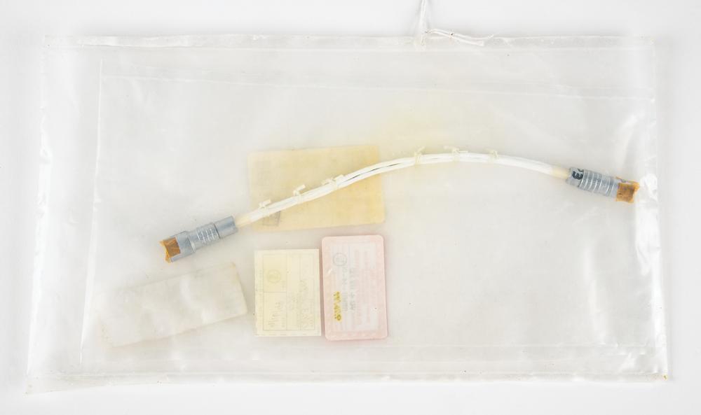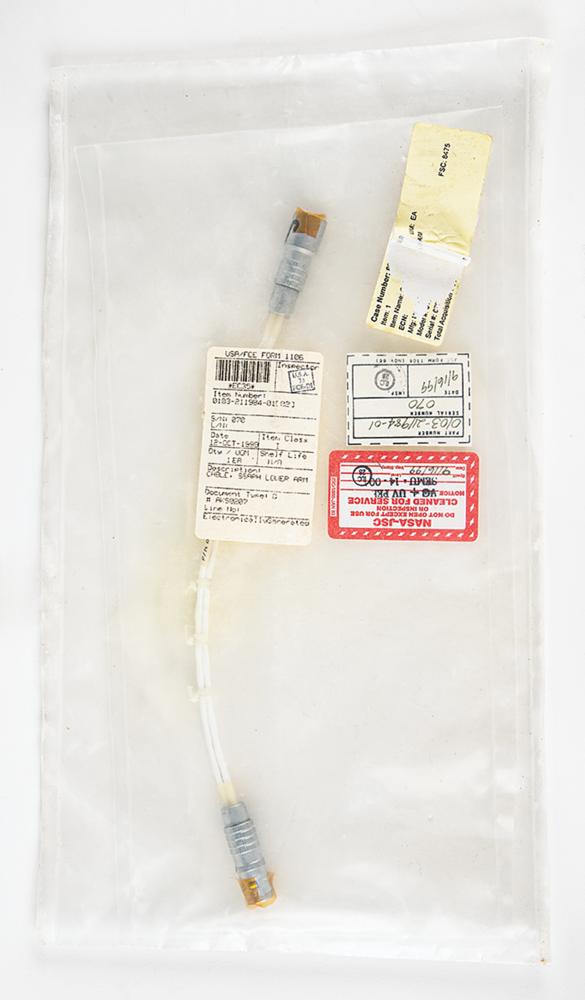Space Shuttle-era Space Suit Power Harness Assembly (SSAPH) lower arm cable, approximately 12" long, comprising a white cable with connectors at each end, labeled as "P/N 0103-211984-01-02, S/N 070." Sealed in its original NASA-JSC cleaning bag with an affixed deaccession label and an attached JSC Project Parts Tag dated October 12, 1999, and listing the item as “Class I.” The Space Suit Assembly Power Harness (SSAPH) moved the power source for the heating elements from the back of the glove to the main structure of the extravehicular mobility unit spacesuit or EMU. In fine condition.