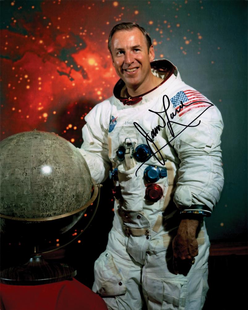 Color glossy 8 x 10 photo of Apollo 13 CDR James Lovell posing in his white space suit with a lunar globe in front of a celestial backdrop, signed in black felt tip. In fine condition.