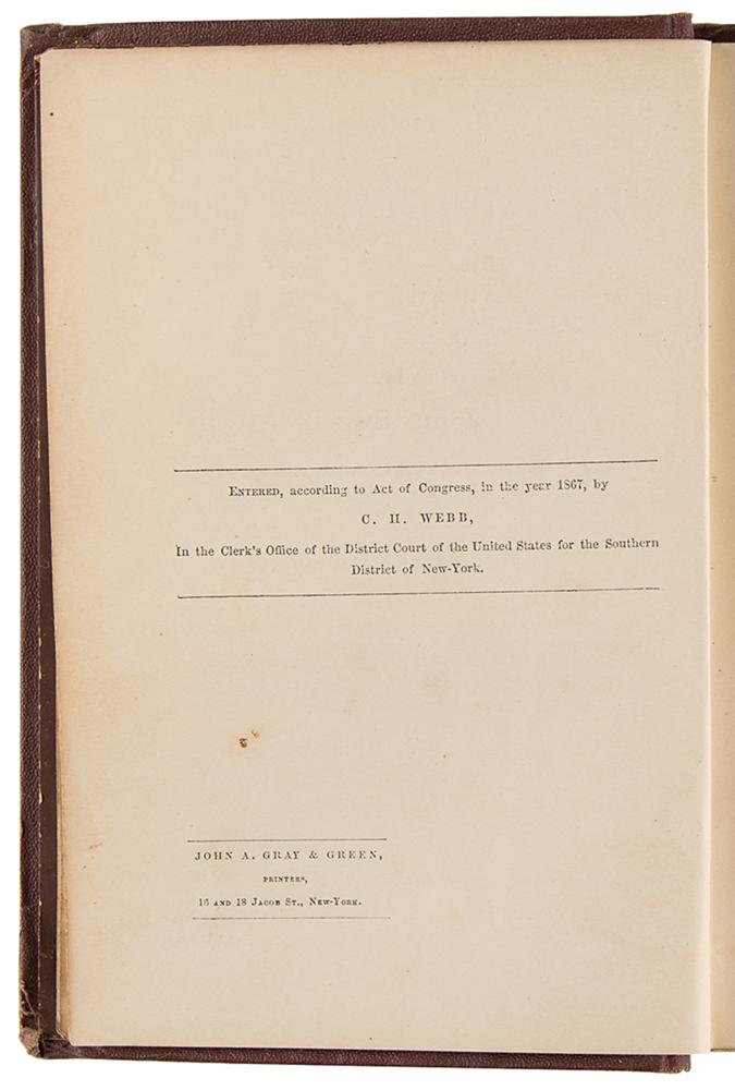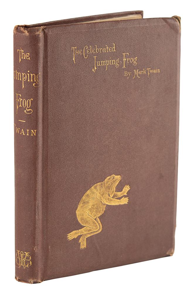 Desirable early printing of Twain's first book, a collection of 27 stories that were previously published in magazines and newspapers: The Celebrated Jumping Frog of Calaveras County, and Other Sketches by Mark Twain. Second edition. NY: C. H. Webb, 1868. Hardcover bound in the publisher's gilt-stamped pictorial brown cloth, 4.75 x 7, 198 pages. Book condition: VG-/None, with bumped corners, wear to spine ends, and some soiling to textblock.