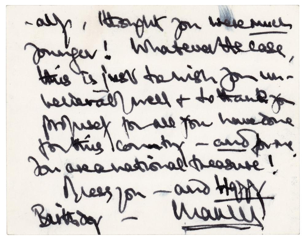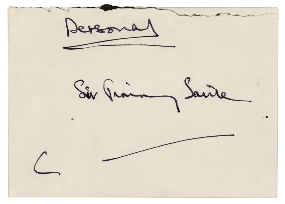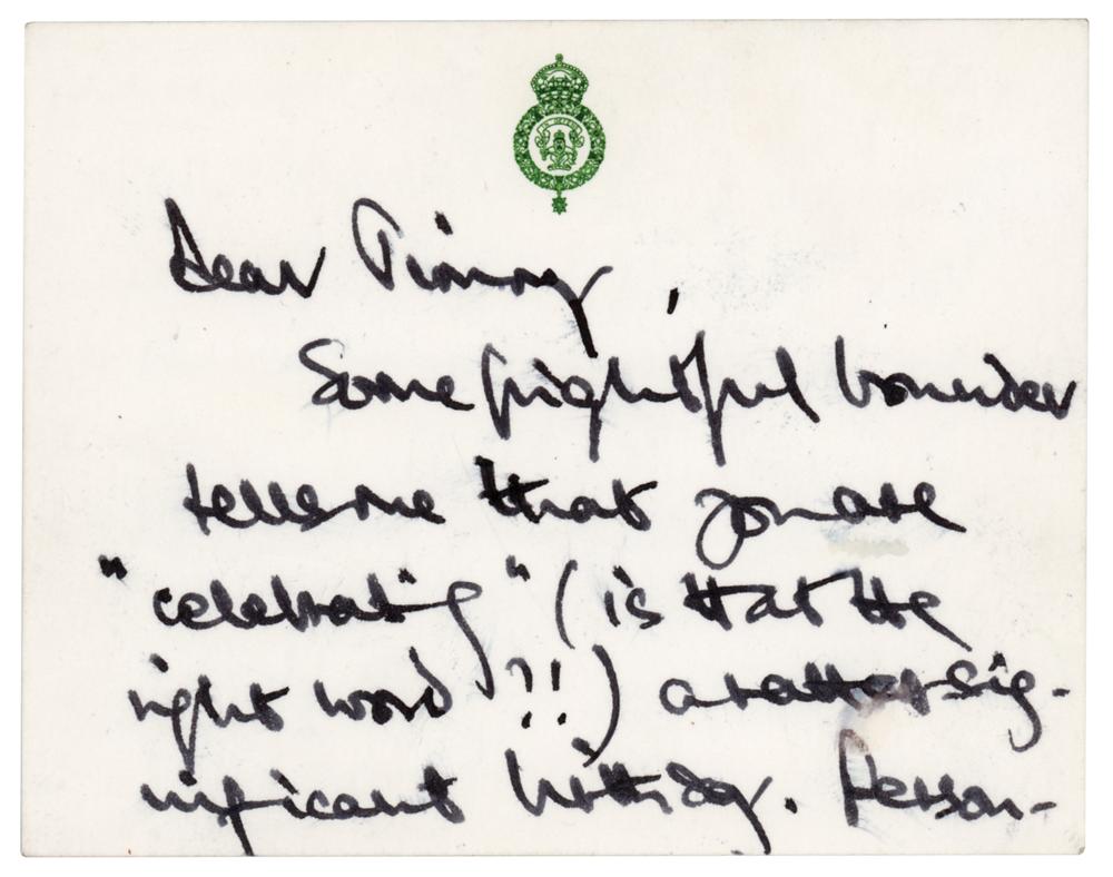 ALS signed “Charles,” penned on both sides of his personal 4.75 x 3.75 Prince of Wales stationery card, no date. Handwritten letter to BBC personality Jimmy Savile, in full: “Some frightful bonder tells me that you are ‘celebrating’ (is that the right word?!) a rather significant birthday. Personally, I thought you were much younger! Whatever the case this is just to wish you unbelievably well + to thank you profusely for all you have done for this country — and for me. You are a national treasure! Bless you — and happy birthday!” In fine condition, with a few ink brushes to the text. Accompanied by the original envelope hand-addressed by Charles, who writes: "Personal, Sir Jimmy Savile."
