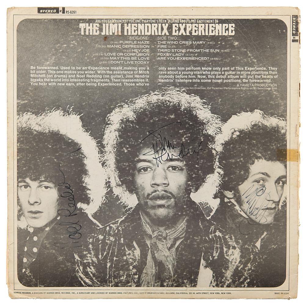 Original U.S. stereo issue of Are You Experienced?, the debut album from the Jimi Hendrix Experience (Reprise Records, RS 6261), signed prominently on the back cover over their respective likenesses in black felt tip by Jimi Hendrix, Noel Redding, and Mitch Mitchell. In very good condition, with scuffing, creasing, an old tape stain, and separation along the spine. Includes its original printed inner sleeve with advertisements for other Reprise Records releases; the record is not included.