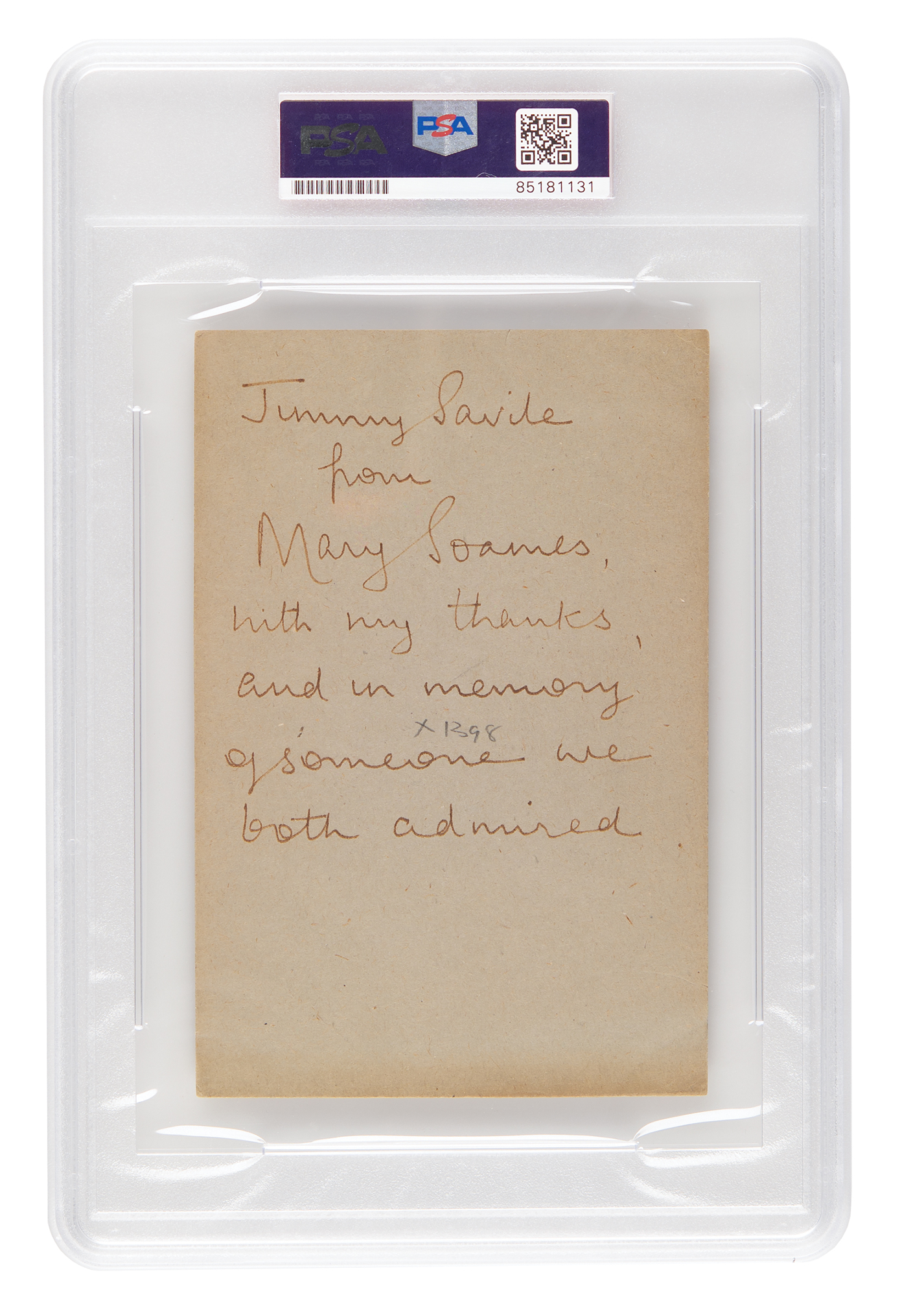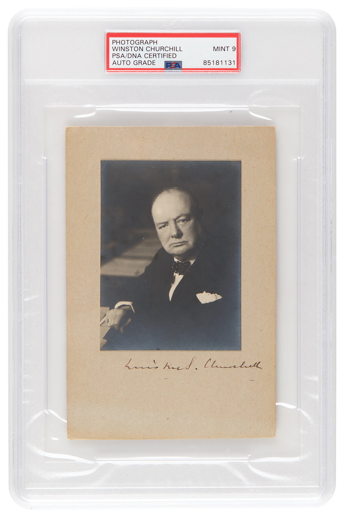 Iconic matte-finish 2.75 x 3.75 portrait of Churchill striking a serious pose, affixed to its original 4.25 x 6.25 mount, neatly signed on the mount in fountain pen, "Winston S. Churchill." In fine condition, with faint silvering to the perimeter of the image. Encapsulated and graded by PSA/DNA as "MINT 9." An enduring portrait of Churchill captured by Walter Stoneman at 10 Downing Street on April 1, 1941, the day Churchill was awaiting word on Germany's fateful invasion of Yugoslavia.