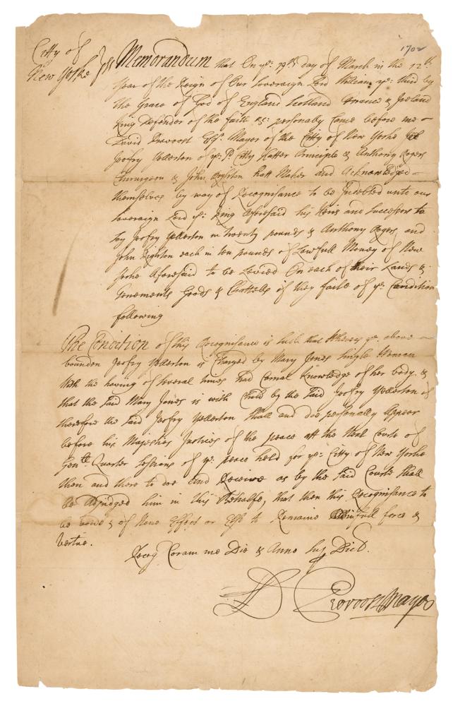 Mayor of New York from 1699 to 1700. Manuscript DS, signed "D. Provost, Mayor," one page, 8.25 x 13, March 19, 1700. Salacious legal document concerning a "seduction" in which Jeffrey Yollerton is charged by Mary Jones, "with having of several times had Carnal Knowledge of her body & that the said Mary Jones is with child." Signed at the conclusion by Provost. In very good to fine condition, with minor edge loss, and light toning along the folds.