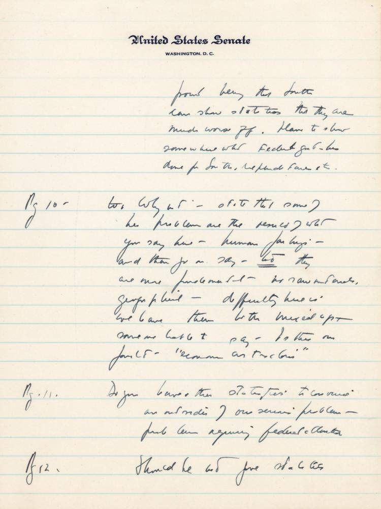 Unsigned handwritten notes by Senator John F. Kennedy, one page, 8 x 10.5, United States Senate letterhead, no date but circa mid-1950s. A page of Senator Kennedy's handwritten notes on labor and the United States economy. In part: "point being that South can show...that they are much worse off. Plan to show somewhere what Federal gov't has done for South...some of her problems are the result of what you say here—human failings...but they are more fundamental...difficulty here is we have them both mixed up." In very fine condition. An interesting piece in which the young Senator recognizes the fundamental and geographical forces affecting the economic realities of the United States' citizenry, and the impact that the federal government might have on the lives of its constituents.