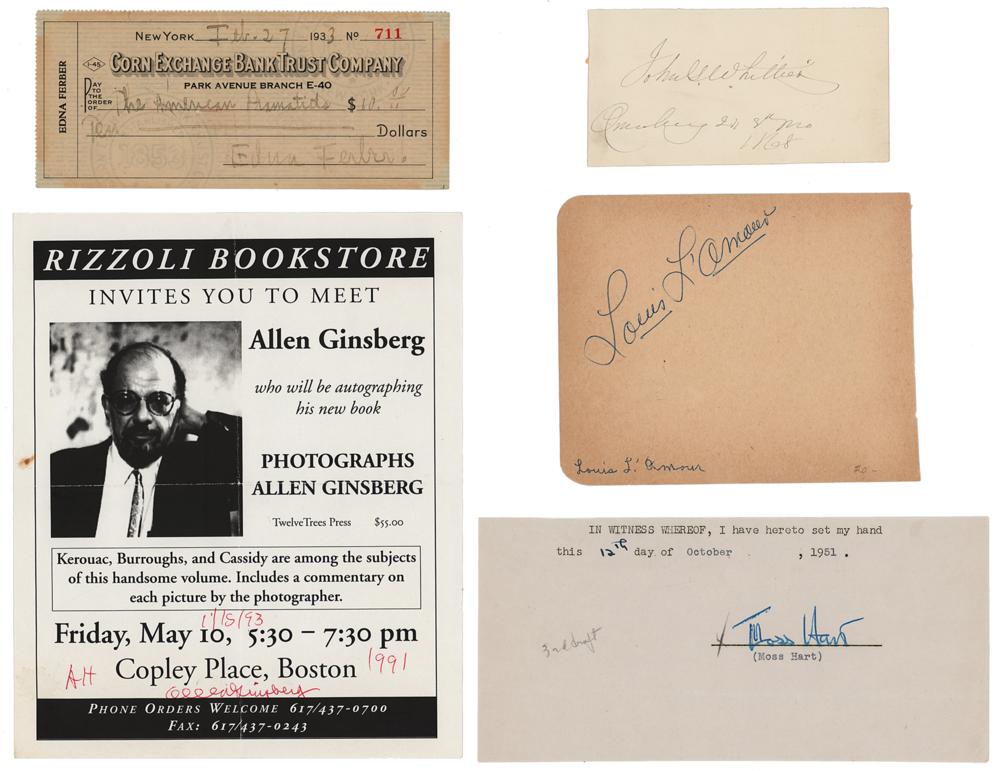Eclectic group of five items signed by noted American authors and poets, including: John Greenleaf Whittier (signature), Edna Ferber (personal check), Louis L'Amour (signature), Moss Hart (partial DS), and Allen Ginsberg (handbill). In overall very good to fine condition, with Ferber's writing faded but legible, and intersecting folds to the Ginsberg handbill.