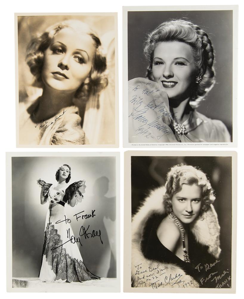 Four glossy photos of actresses from classic horror films, ranging in size from 7.25 x 9.5 to 8 x 10, each signed and inscribed in ink by the subject. Includes: Fay Wray, Gloria Stuart, Mae Clarke (signed twice), and Ilona Massey. In overall fine condition, with a few dings to the edges.