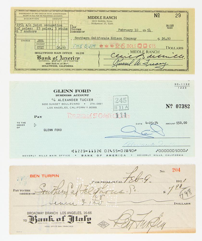Group of nine checks signed by prominent Hollywood figures of the 20th century, ranging in date from 1921 to 1975, including: Ben Turpin, Cecil B. deMille, Elizabeth Montgomery, Agnes Moorehead, Joanne Woodward, Rosalind Russell, Warren Beatty, Glenn Ford, and Walter Winchell. In overall fine condition.