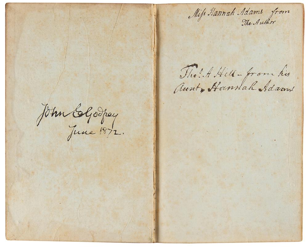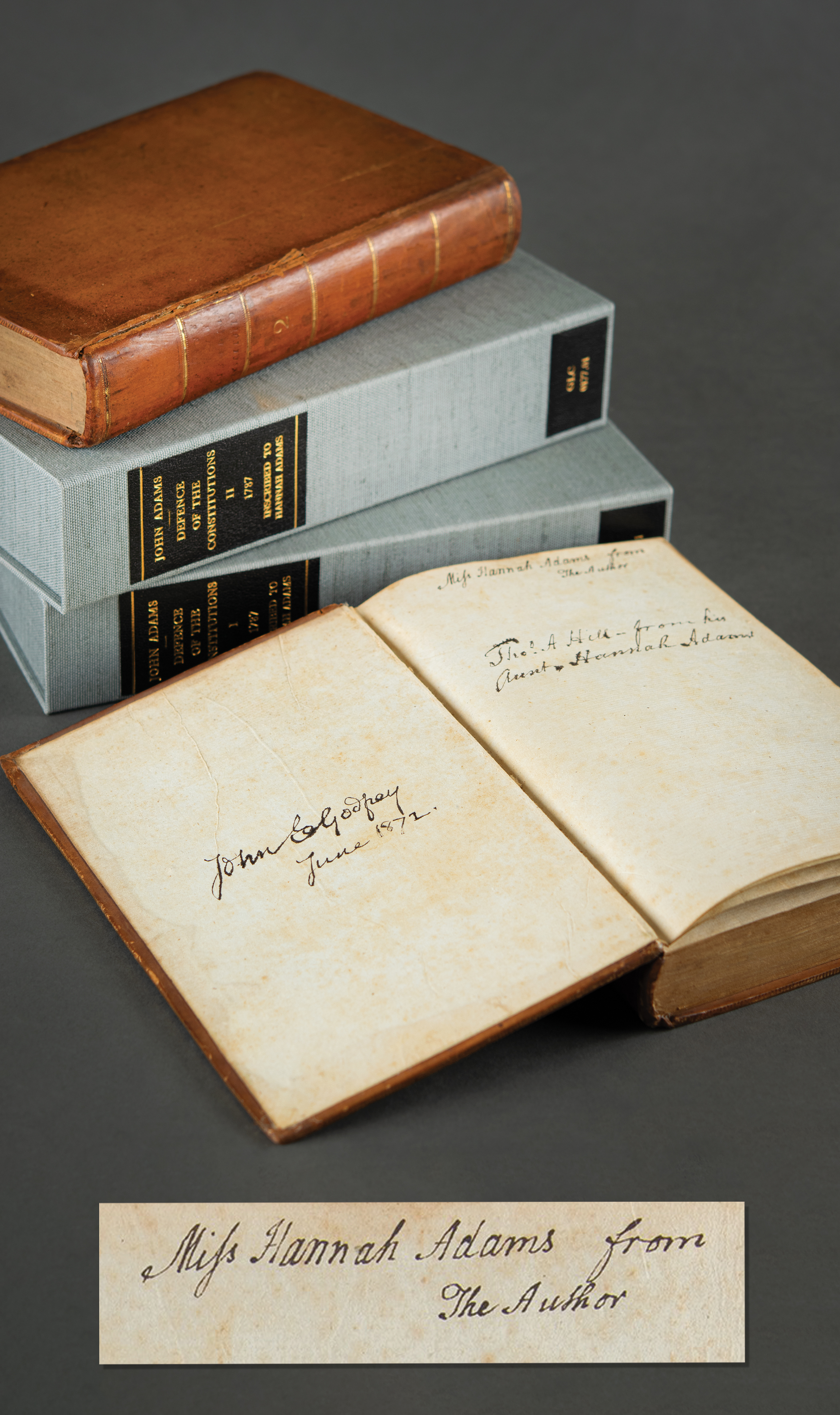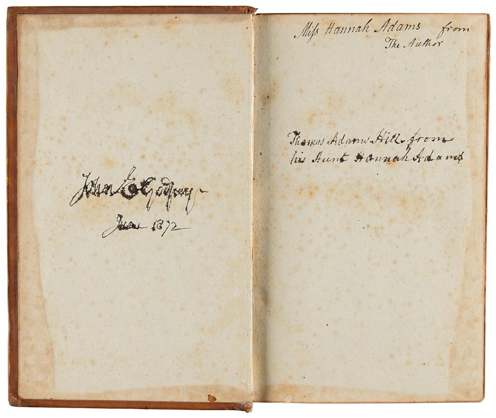 The recipient of these volumes, Hannah Adams (1755-1831), was a distant cousin of John Adams and the first woman in the United States to work professionally as a writer, authoring books on comparative religion and early United States history. Exceedingly rare in signed copies, and representing one of Adams's principal contributions to the early theory of American government, this is a remarkable and historically significant pair of books.
